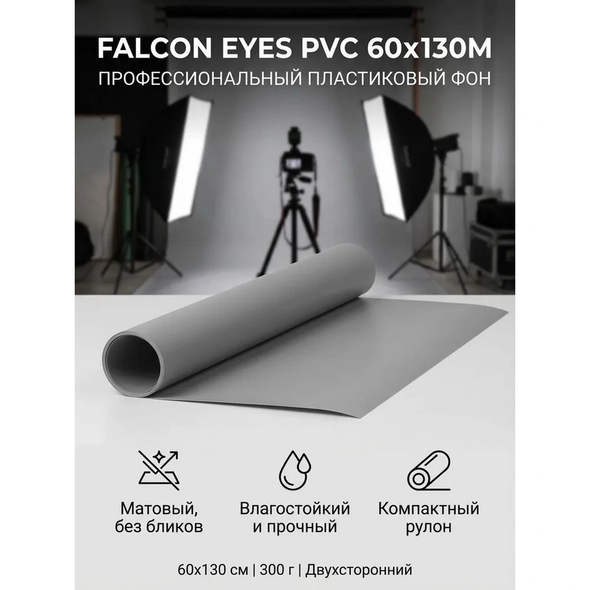Фон пластиковый PVC 60х130M отлично подойдет в случае, когда требуется однотонная серая матовая поверхность для фото- или видеосъемок. Малый вес фона (0.3 кг) и компактные размеры рулона (60х6х6 см) сделают его незаменимым как в небольшой офисной, так и в профессиональной фотостудии.