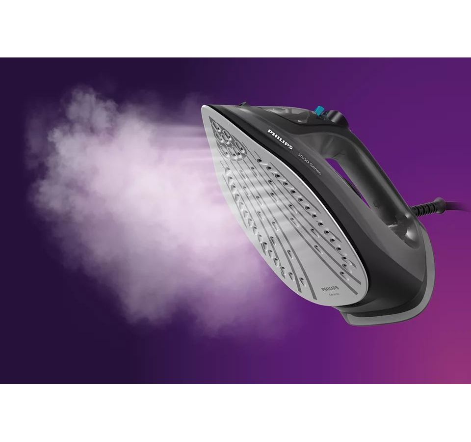 Паровой утюг серии 3000 позволяет легко разглаживать даже жесткие складки благодаря мощной подаче пара. Керамическая подошва обеспечивает гладкое скольжение, а резервуара для воды 300 мл хватит для глажения небольшой стопки вещей даже без пополнения.