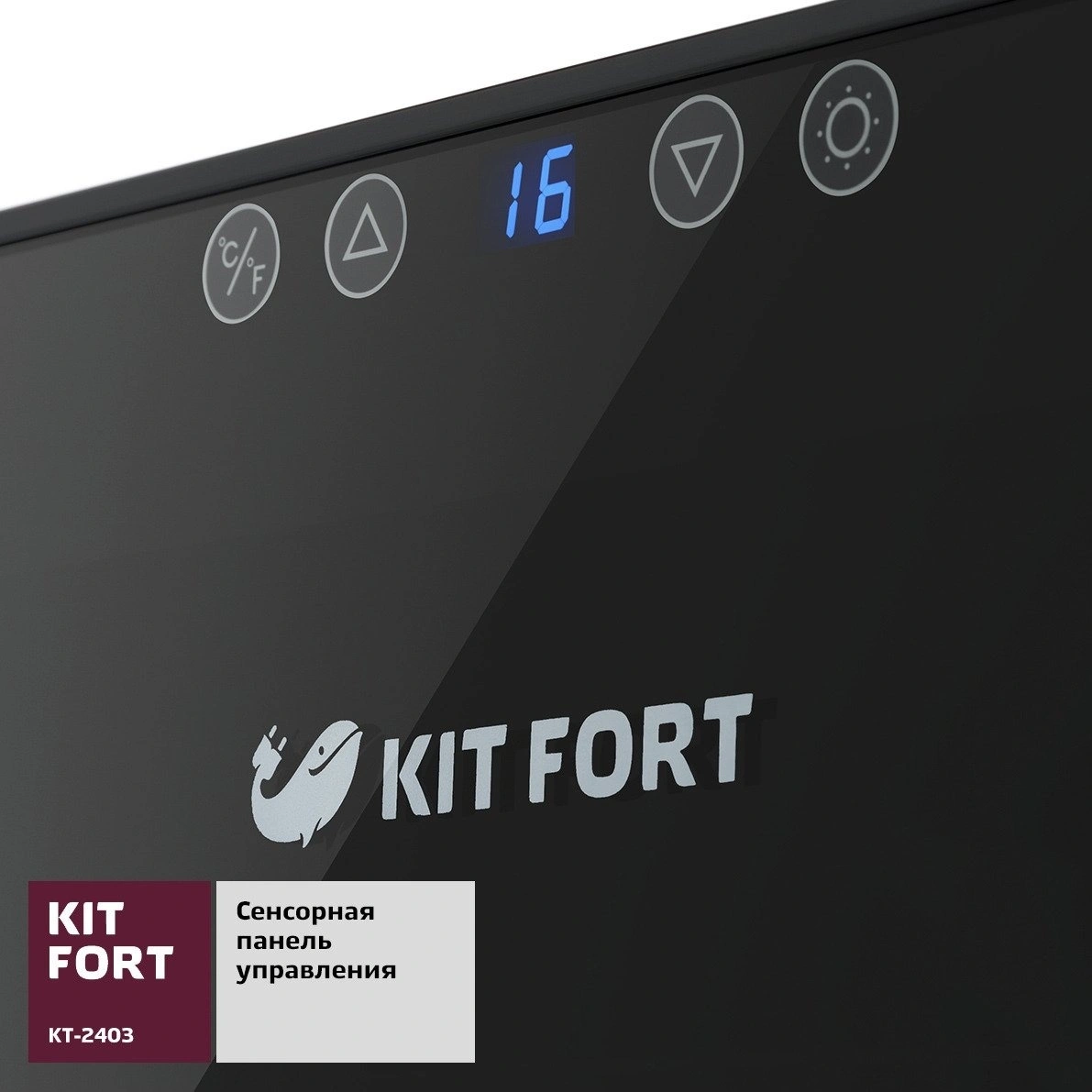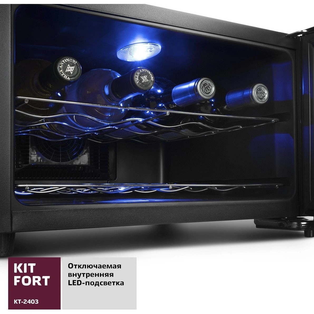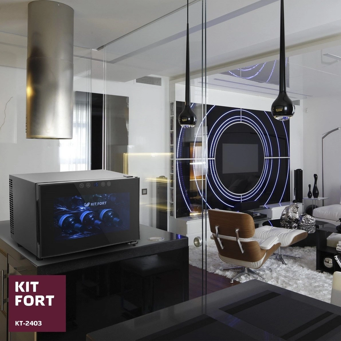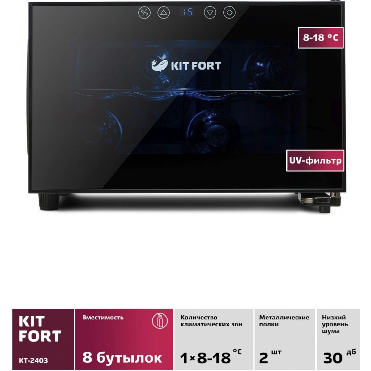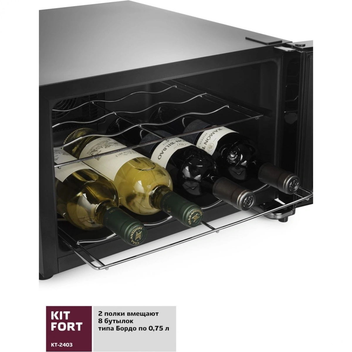 Винный шкаф Kitfort KT-2403 — это холодильник для хранения вина в бутылках. В винном шкафу имеются восемь лотков для укладки бутылок, расположенных на двух полках. Дверца шкафа прозрачная, в ее верхней части расположена сенсорная панель управления со светодиодным дисплеем. Охлаждение производится при помощи термоэлементов Пельтье, поэтому в винном шкафу не используется никаких вредных хладагентов, а уровень шума меньше, чем у компрессорных холодильников, и отсутствуют вибрации. Рабочий температурный диапазон винного шкафа выставляется в пределах от 8 °С до 18 °С с шагом в 1 °С.