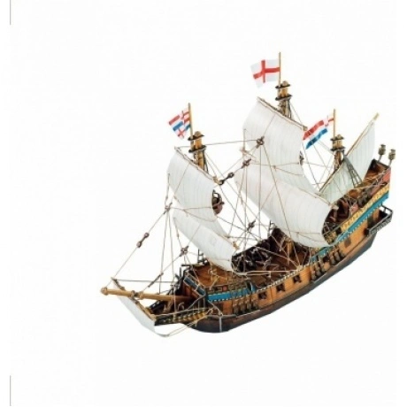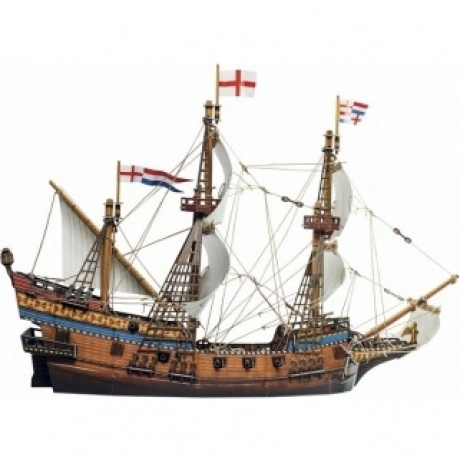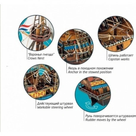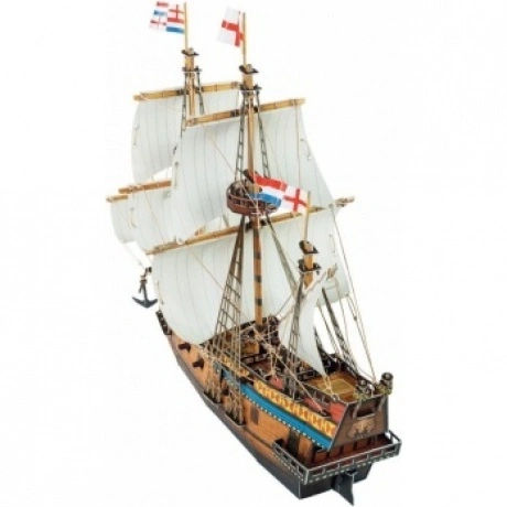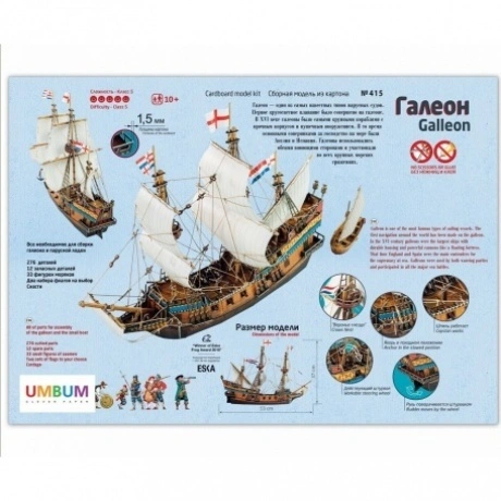 Галеон — один из самых известных типов парусных судов. Галеоны были самыми крупными кораблями своего времени, с прочным корпусом, тремя высокими мачтами, с пушечным вооружением. Появление таких кораблей изменило ход морского боя. В XVI веке основными соперниками за господство на море были Англия и Испания. Галеоны использовались обеими воюющими сторонами и участвовали во всех крупных морских сражениях. Фигурки мореходов, артиллеристов и воинов включены в набор. Также в наборе есть детали для сборки парусной лодки. Два комплекта флагов дают возможность выбрать, на чьей стороне ваш боевой корабль. Есть флаги Английского флота, а также флаги Испанской Непобедимой армады. Сочетание в модели корабля материалов разного характера не только обогащает впечатление от модели, но и делает сборку более сложной. При переходе на новый материал нужно приспосабливаться к его свойствам, менять приемы работы. Это разнообразие делает сборку еще интересней. Для сборки модели не понадобятся режущие инструменты или клей. Детали уже вырезаны и нужно просто вынуть их из листа картона и соединить между собой.