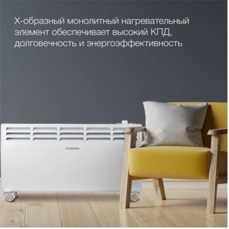 Конвектор Starwind SHV5520 будет отличным помощником, когда нужно быстро обогреть помещение. Максимальная мощность – 2000 Вт, при необходимости можно установить уровень на 1000 Вт. Механическая панель управления дает возможность быстро регулировать мощность и задать температурный режим. Рекомендуемая площадь – до 25 м2. Конвектор способен в короткий срок нагреть воздух в помещении, несмотря на свои небольшие габариты. Внутри установлен эффективный и бесшумно работающий Х-образный нагревательный элемент, обеспечивающий быстрый нагрев воздуха. Если вы хотите сэкономить пространство в комнате, то конвектор можно повесить на стену на крепления, идущие в комплекте. Электрический конвектор Starwind SHV5515 защищен от перегрева и опрокидывания, а механическое управление позволяет безопасно пользоваться нагревательным прибором людям разного возраста.