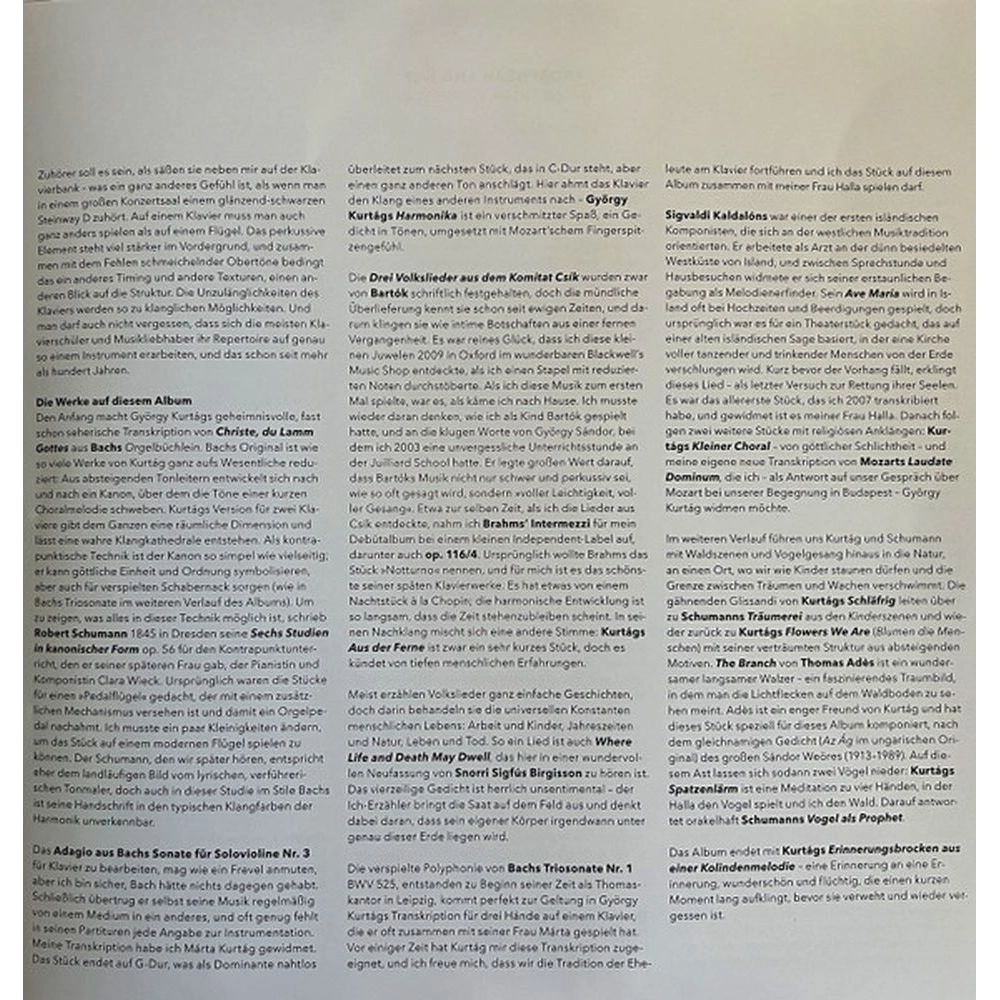 J.S. Bach. Christe, du Lamm Gottes, BWV 619 (Arr. G. Kurtag), Schumann. Study in Canonic Form, Op. 56 No. 1, J.S. Bach. Adagio from Sonata for Solo Violin in C major (Arr. Vikingur Olafsson), Kurtag. Harmonica (Hommage a Borsody Laszlo) (From Jatekok / Book 3), Bartok. I. Rubato (Three Hungarian Folksongs from the Csik), Bartok. II. L'istesso tempo (Three Hungarian Folksongs from the Csik), Bartok. III. Poco vivo (Three Hungarian Folksongs from the Csik), Brahms. Intermezzo Op. 116, No. 4, Kurta