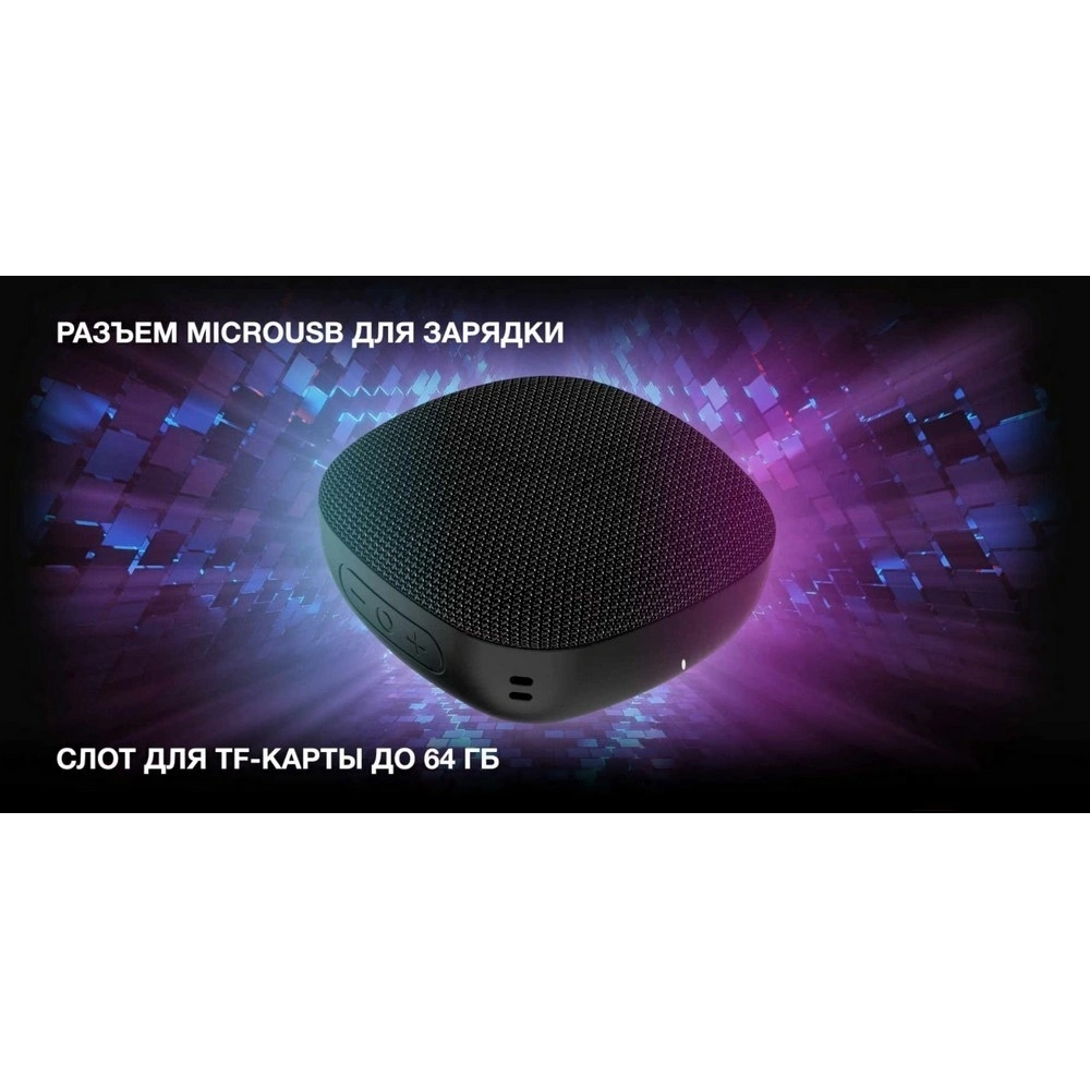 Колонка оснащена одним динамиком мощностью 5 Вт, предлагая чистый моно звук, который удовлетворит ваши повседневные аудиопотребности. Встроенный аккумулятор емкостью 1200 мА·ч обеспечивает до 7 часов непрерывного воспроизведения, что делает её отличным вариантом для длительных выездных мероприятий.