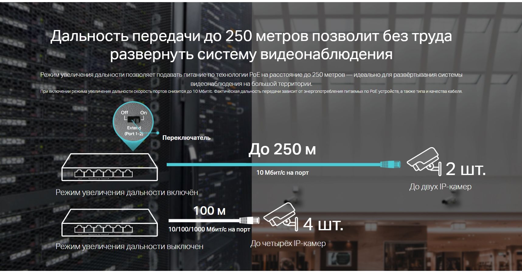 Шесть портов RJ45 10/100/1000 Мбит/с. Порт PoE++ и три порта PoE+ позволят передавать данные и подавать питание по одному кабелю вместо двух. Совместимость с питаемыми устройствами, поддерживающими стандарты IEEE 802.3af/at/bt. Приоритизация DSCP и 802.1p обеспечит плавность передачи чувствительного к задержкам трафика. До 30 Вт на порт PoE+, до 60 Вт для порта PoE++. Общий бюджет PoE составляет 64 Вт1. Режим увеличения дальности позволяет подавать питание и передавать данные на расстояние до 250 метров2. Функция автоматического восстановления PoE позволяет автоматически перезагружать неотвечающие питаемые устройства. Предварительная настройка не требуется — достаточно просто включить устройство.