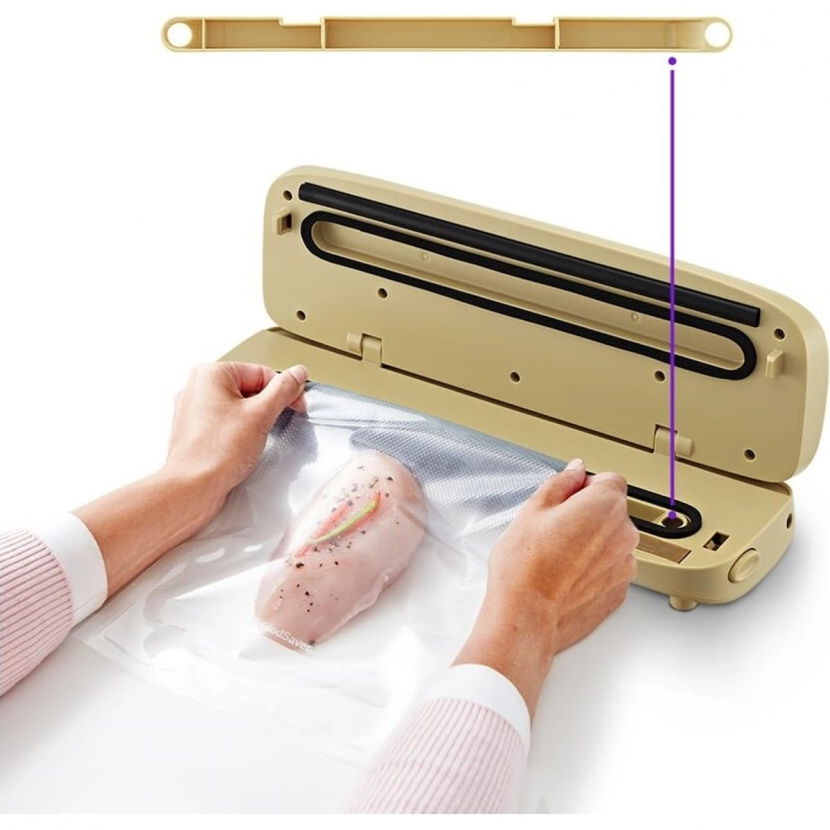 Открытый край пакета укладывается под крышку прибора, после чего вакууматор начинает выкачивать из него воздух. Контейнер для жидкости можно легко снять и очистить. Прорезиненные ножки не дают скользить по столу во время работы.