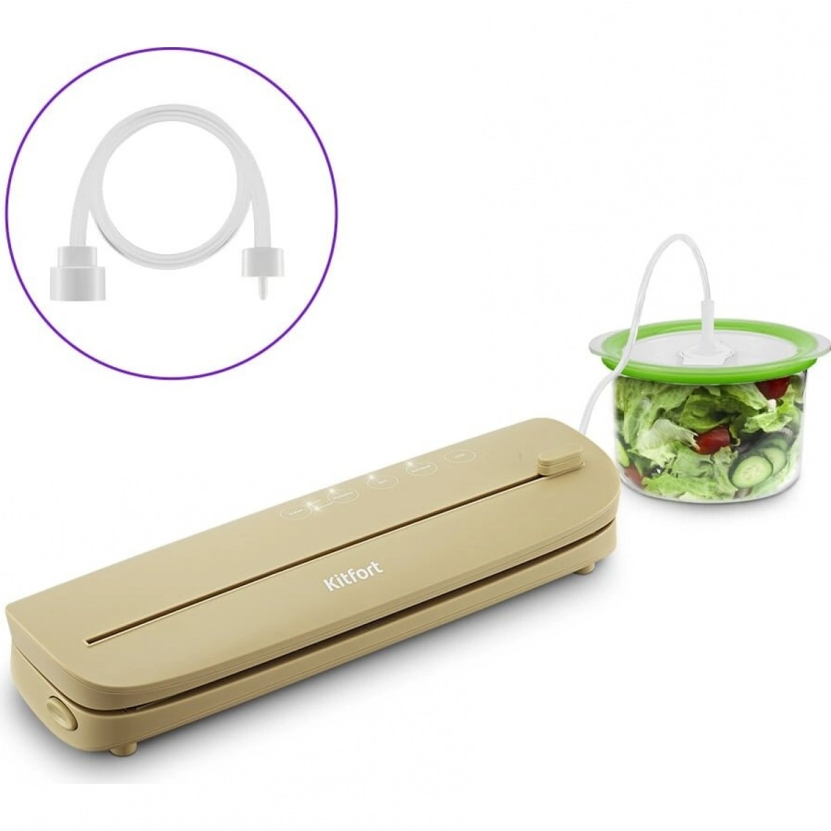 У прибора есть функция вакуумирования продуктов в специальных контейнерах (контейнеры не входят в комплект). Вакуумирование осуществляется с помощью шланга из комплекта.
