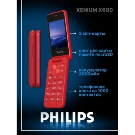 Сотовый телефон Xenium X680 выполнен в раскладном корпусе красного цвета. В устройстве установлен 2.8-дюймовый экран. Поддерживается одновременная работа с двумя картами SIM. Для фото и видеороликов предусмотрена камера с разрешением 0.3 Мп.