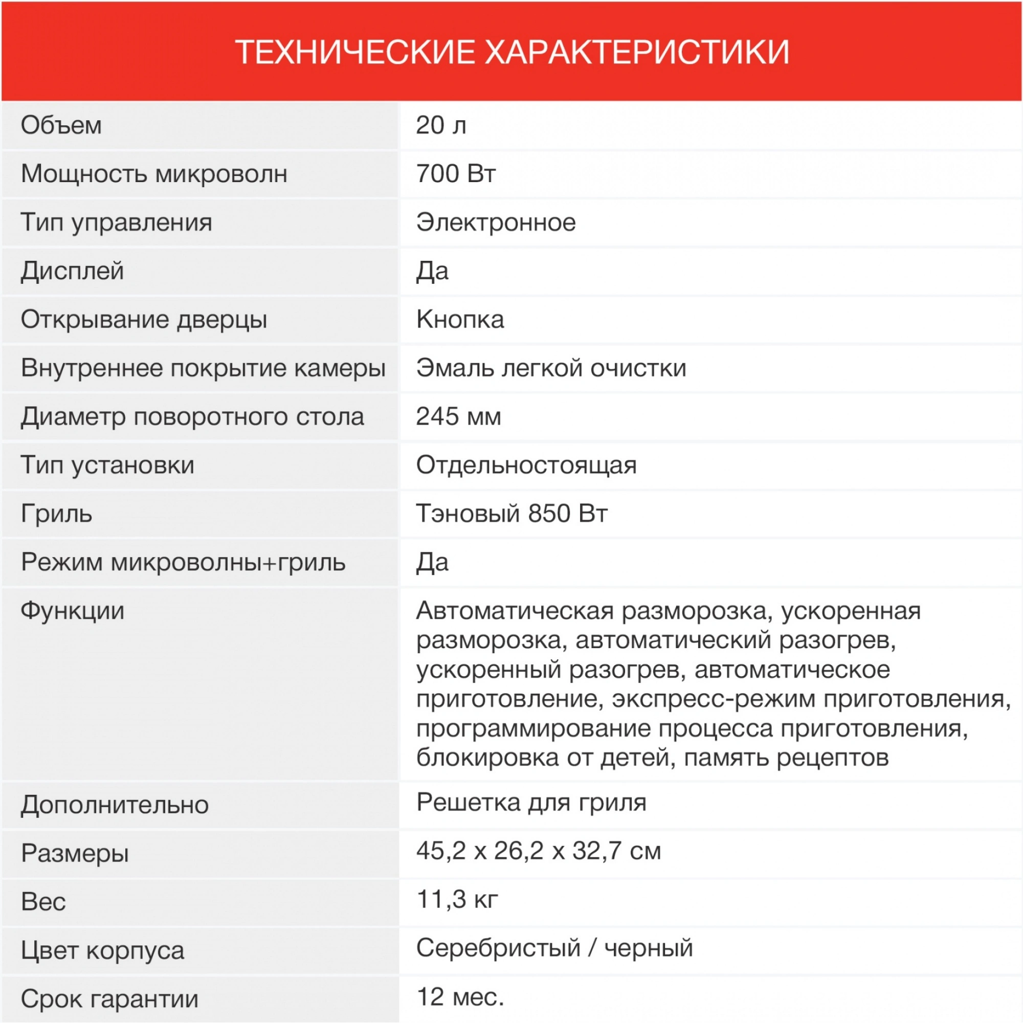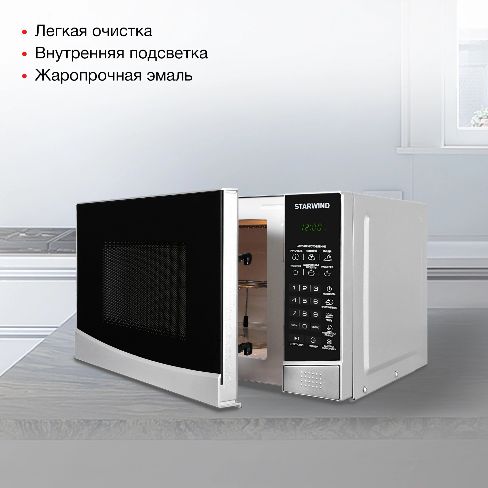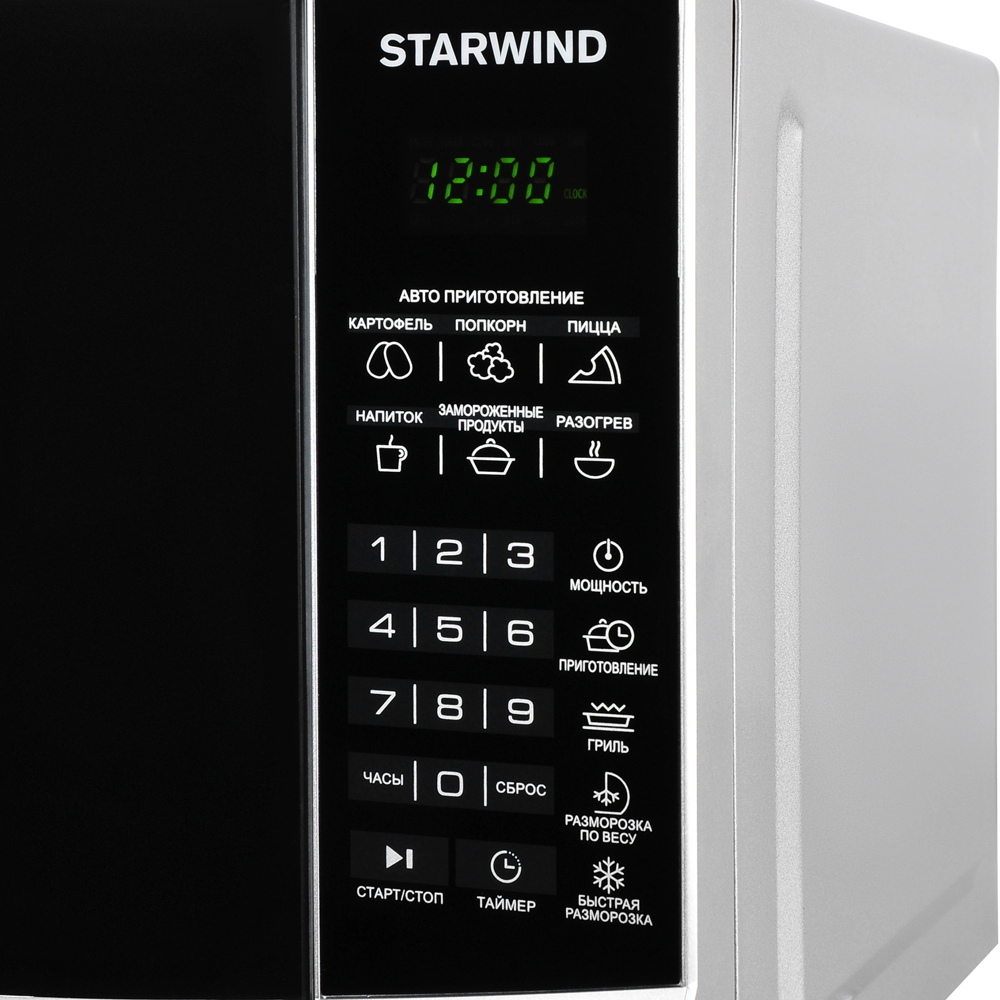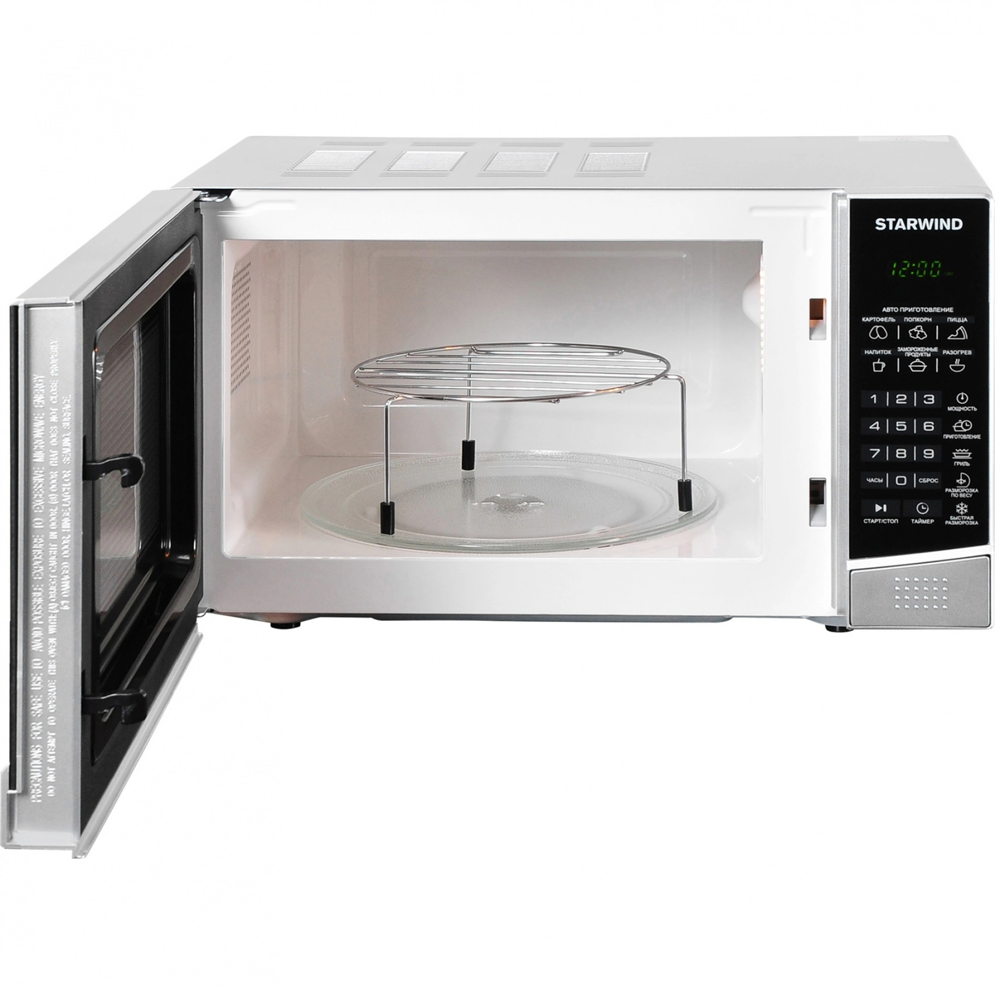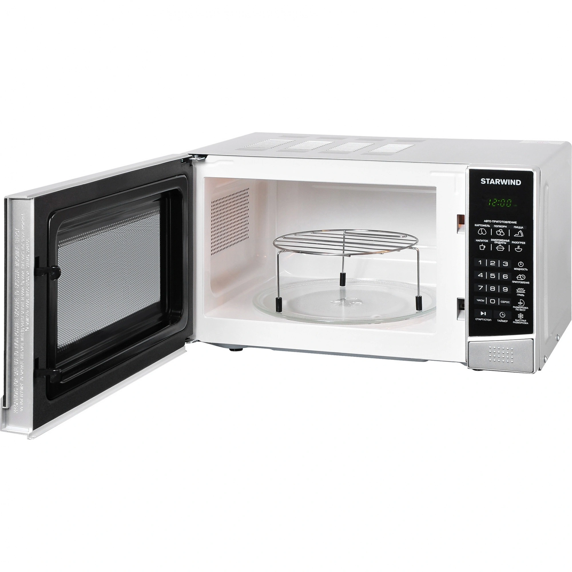 Стильная, мощная и многофункциональная микроволновая печь STARWIND SMW3120 станет незаменимым помощником на кухне для каждой хозяйки или в офисе. Данная модель выполнена в гармоничном дизайне классической формы. Основные цвета – черный и серебристый. Корпус прибора изготовлен из металла, передняя панель и дверца – из пластика. На верхней части и по бокам предусмотрена перфорация для вывода горячего воздуха, образующегося во время нагрева, что стоит учитывать в момент установки прибора. Открытие дверцы осуществляется с помощью кнопки, что позволяет задействовать всего один палец что актуально, если вы уже держите в руках блюдо, подготовленное для установки в СВЧ STARWIND. Относительно программного обеспечения, то данная печь может все!