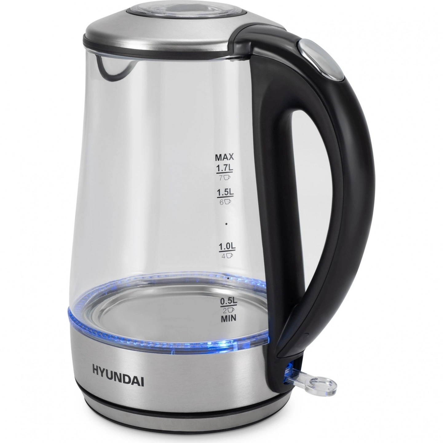 Стеклянно-металлический электрический чайник Hyundai HYK-G8406 объемом 1.7 л и мощностью 2200 Вт позволит быстро вскипятить 0.5-1.7 л воды. Модель оснащена голубой подсветкой и функцией автоматического отключения нагрева при закипании, а также встроенным фильтром от накипи.