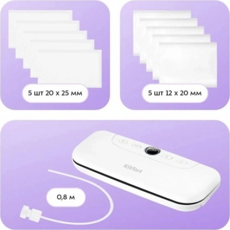 Длина сетевого шнура составляет 0,8 метра, что обеспечивает удобство размещения устройства на любой кухне, не занимая много свободного пространства. Вакуумные упаковщики Kitfort станут неотъемлемым помощником в любой кухне, поддерживая продукты свежими, вкусными и готовыми к использованию тогда, когда это необходимо.