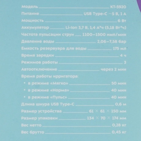 Ирригатор Kitfort КТ-5920 с 3 режимами давления воды обеспечивает необходимый уровень гигиены полости рта. Емкость резервуара для жидкости составляет 175 мл, при этом она подается по струйному принципу. В минуту насадка совершает 1100-1500 пульсаций. Это позволяет выбрать мягкое, среднее или интенсивное давление воды. До 50 минут подряд Kitfort КТ-5920 работает от аккумулятора. Для присоединения к розетке прибор имеет 0.6-метровый кабель. Время зарядки составляет около 4 ч.
