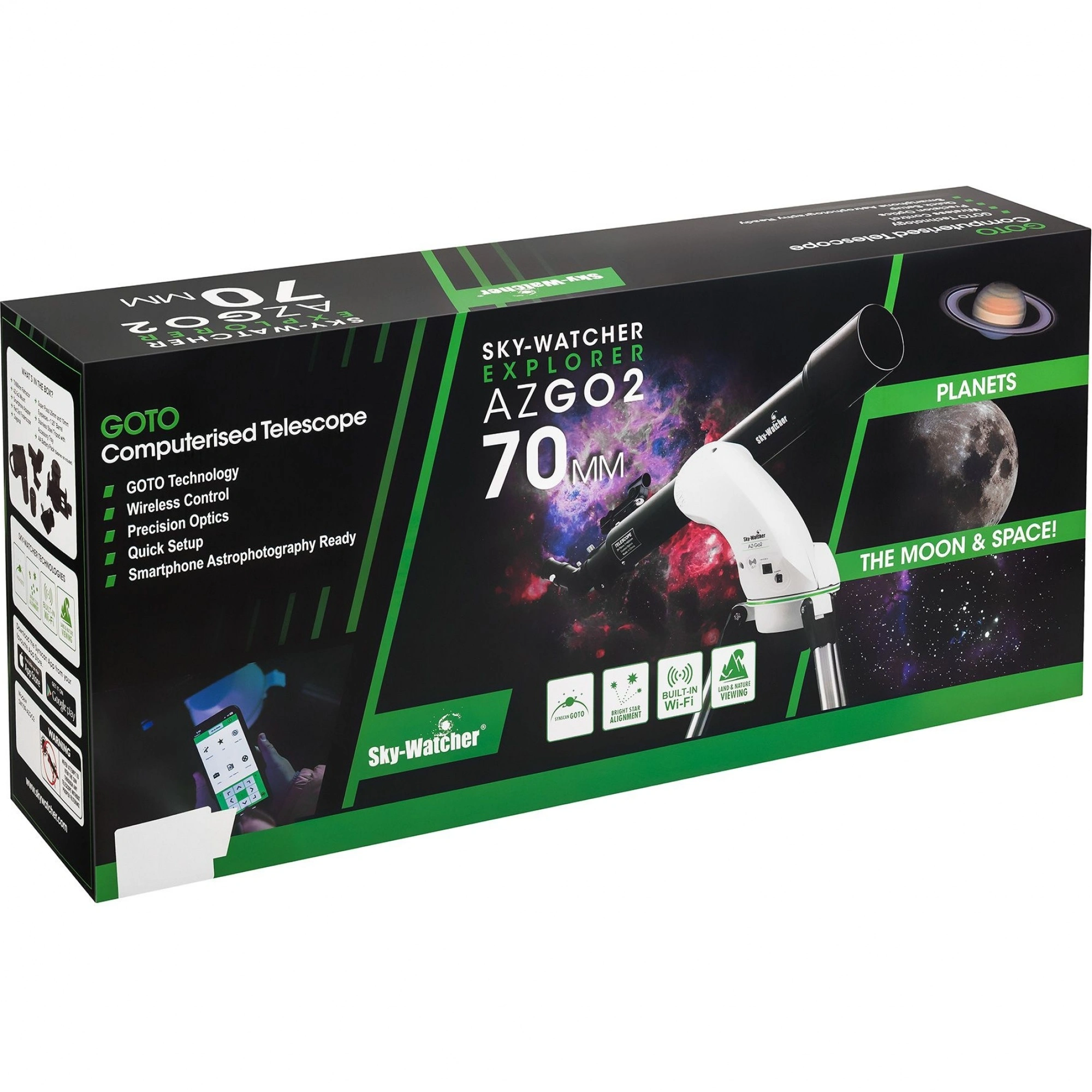 Телескоп Sky-Watcher 709AZ-GO2 SynScan GOTO с компьютеризованной азимутальной монтировкой относится к классу рефракторов-ахроматов и отлично подходит как продвинутым, так и начинающим астрономам для изучения планет Солнечной системы и некоторой части объектов дальнего космоса. Благодаря фокусному расстоянию 900 мм и апертуре 70 мм в такой телескоп можно увидеть фазы Венеры, лунные кратеры диаметром 8 км, кольца Сатурна, некоторые крупные шаровые и рассеянные скопления, а при идеальных условиях наблюдений – даже Большое Красное Пятно на Юпитере и щель Кассини. Изображение, видимое через данный прибор, остается стабильно четким и детализированным, так как хроматические аберрации в его оптической системе сведены к минимуму.