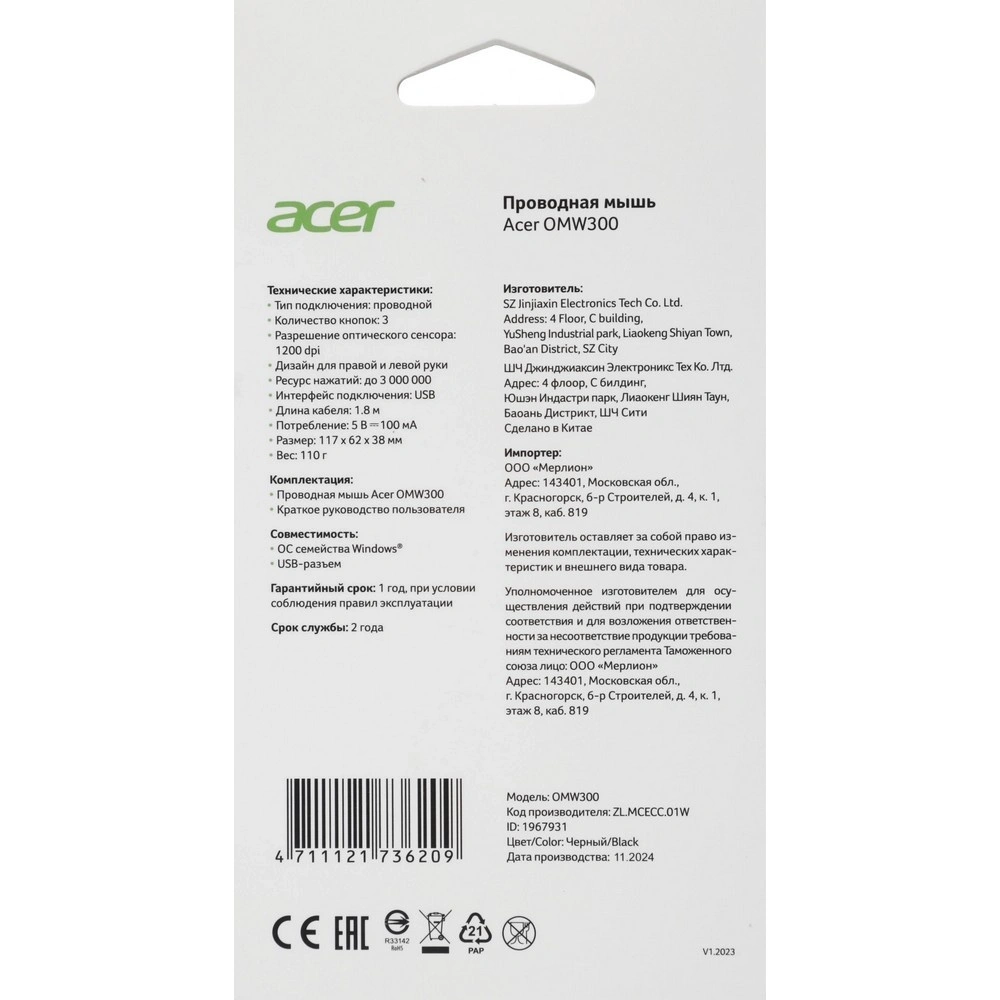 Это идеальный выбор для тех, кто ищет надежную, простую в использовании мышь от надежного бренда Acer, подходящую для любых задач — от работы в офисе до домашнего компьютера.