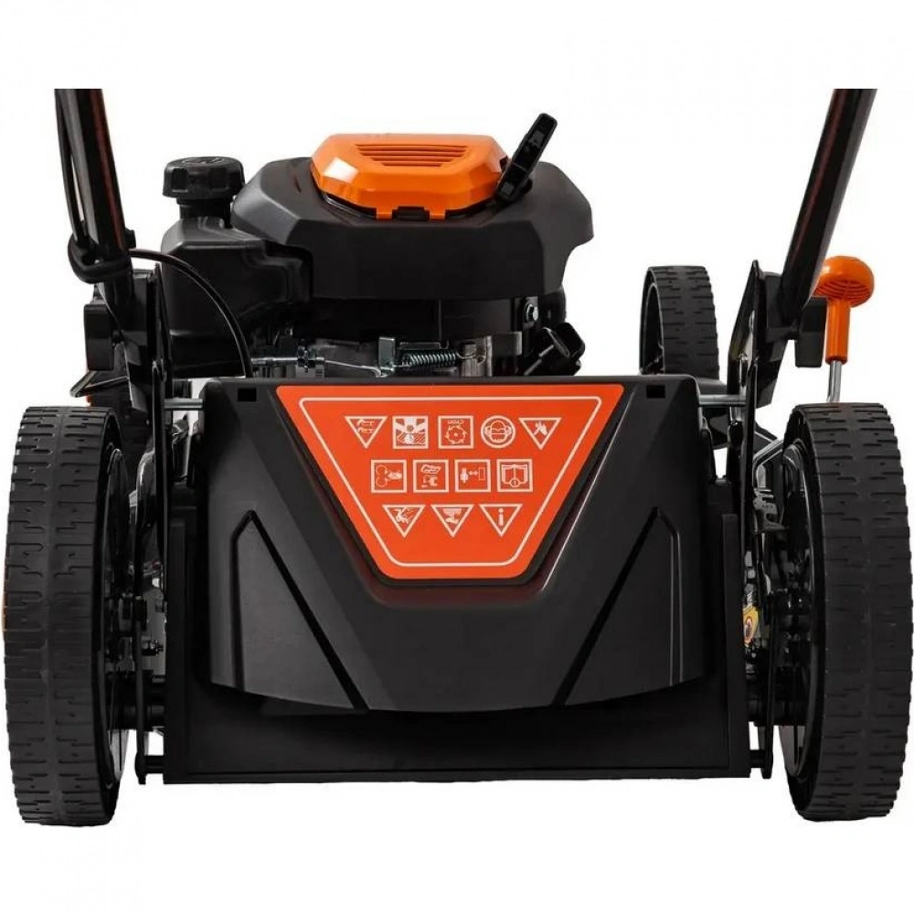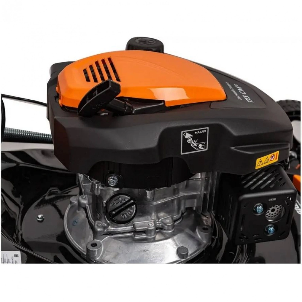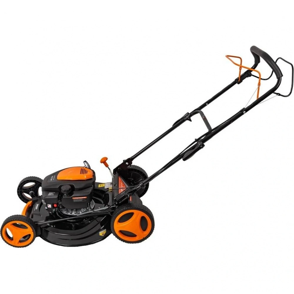 Газонокосилка оснащена вместительным травосборником объемом 60 литров, что минимизирует необходимость частого опорожнения в процессе работы. Кроме того, агрегат обладает функцией мульчирования, что позволяет эффективно перерабатывать скошенную траву в натуральное удобрение для газона.
