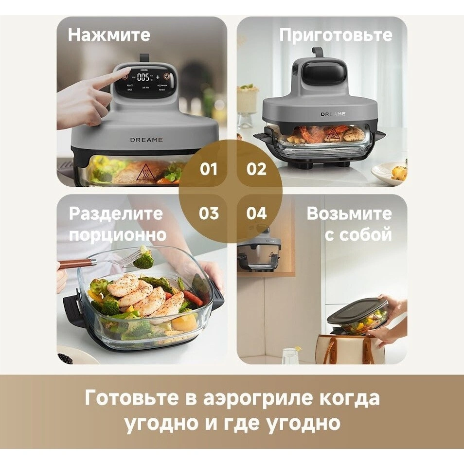 Аэрогриль Dreame Tasti PT60 компактный аэрогриль с двумя стеклянными чашами 2.5 и 4.5 литра. Занимает минимум места на кухне. Имеет 5 автоматических программ приготовления. Мощность составляет 1500 Вт. На чашу можно надеть крышку и взять приготовленное блюдо собой в дорогу.