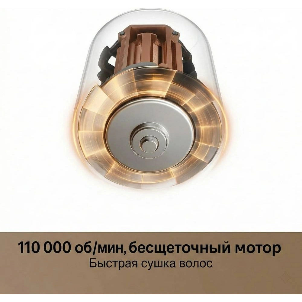 ?Бесщёточный мотор на 110 000 об/мин обеспечивает быструю сушку, сохраняя структуру волос.
