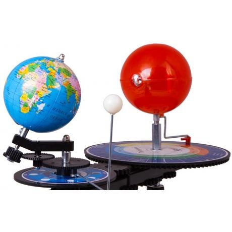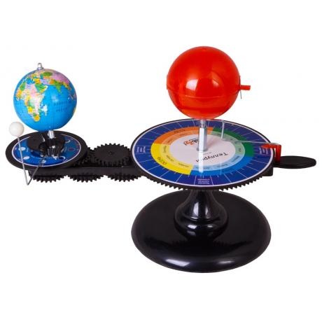 Настольная механическая модель для демонстрации движения Земли и Луны вокруг Солнца. Наглядное пособие для изучения астрономии и географии. Все основные элементы прибора изготовлены из прочного и безопасного пластика. Диаметр модели Солнца составляет 100 мм, Земли – 85 мм, Луны – 18 мм. Прибор приводится в движение специальной ручкой. Внутри модели Солнца находится яркая лампочка.