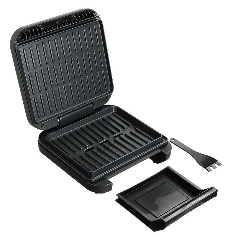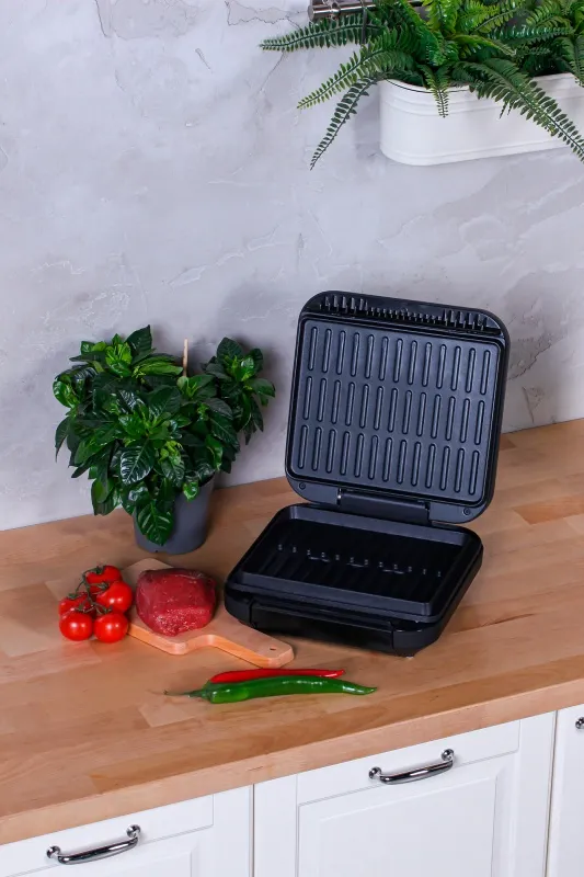 Компактная модель электрогриля, выполненная из качественных и прочных материалов. Имеет простую конструкцию и удобное использование. Черный цвет модели будет хорошо сочетаться с любым интерьером. С его помощью можно будет приготовить стейки из мяса, поджарить овощи или рыбу.