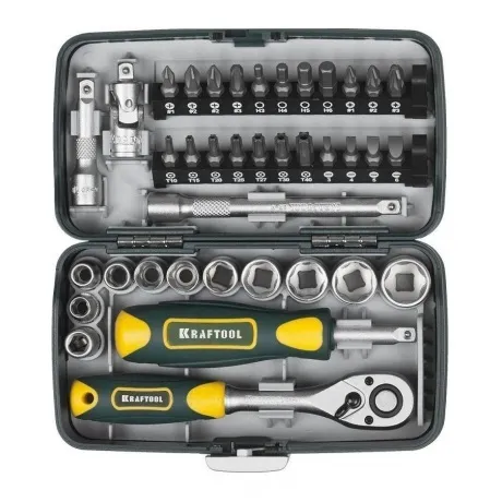 Биты 25 мм 22 шт. — PH 1, 2, 2, 3, SL 3, 4, 5, 6, PZ 1, 2, 3, HEX 3, 4, 5, 6, TX10, 15, 20, 25, 27, 30, 40. Адаптер для бит — SQ1/4 x HEX1/4. Вороток-отвертка 1/4. Торцовые головки 1/4 10 шт. — 5.5, 6, 7, 8, 9, 10, 11, 12, 13, 14 мм. Шарнир карданный 1/4. Удлинители 1/4? 2 шт. — 50 мм, 100 мм. Трещотка, 72 зубца 1/4?.