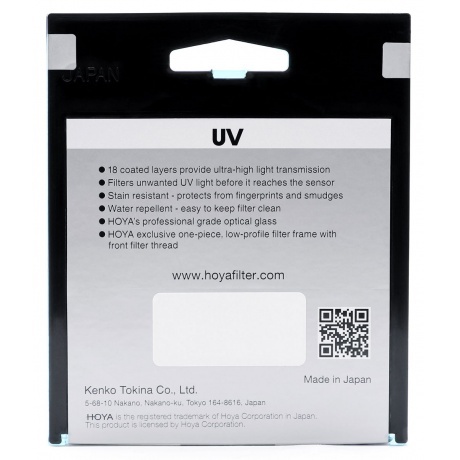 HOYA FUSION ONE объединяет в себе все ценные базовые характеристики, такие как многослойное покрытие, сверхвысокое пропускание света, высококачественное оптическое стекло и тонкую оправу, и в то же время включает в себя защиту от пятен и водоотталкивающее покрытие, чтобы соответствовать новым стандартам в индустрии фотографических оптических аксессуаров. Фильтры HOYA серии FUSION ONE производятся в Японии из высококачественного оптического стекла и рассчитаны на профессиональный сегмент фотографов. На фильтры нанесено 18-слойное мультипросветление, которое устраняет блики и обеспечивает максимальную степень светопропускания. Тонкая алюминиевая оправа снижает риск виньетирования при использовании с широкоугольной оптикой. Для обеспечения максимальной резкости само стекло фильтра установлено точно параллельно плоскости сенсора камеры. Ультрафиолетовые защитные фильтры служат для защиты передней линзы объектива, не влияя при этом на качество изображения. Фильтр защищает линзу от загрязнений, царапин и даже сильных ударов. Также он обладает дополнительной защитой от ультрафиолетового излучения, которое невидимо человеческим глазом, однако оказывает негативное влияние на изображение в виде появления дымки и падения чёткости (особенно это заметно при съёмке в горах и возле крупных водоёмов). Данная модель также обладает свойствами отсечения ультрафиолета высокой интенсивности, что благотворно сказывается на чёткости снимков и цветопередаче, особенно если снимать в горах или вблизи крупных водоёмов. Таким образом, фильтр не оказывает практически никакого негативного влияния на цветовой баланс, контрастность или чёткость изображения.