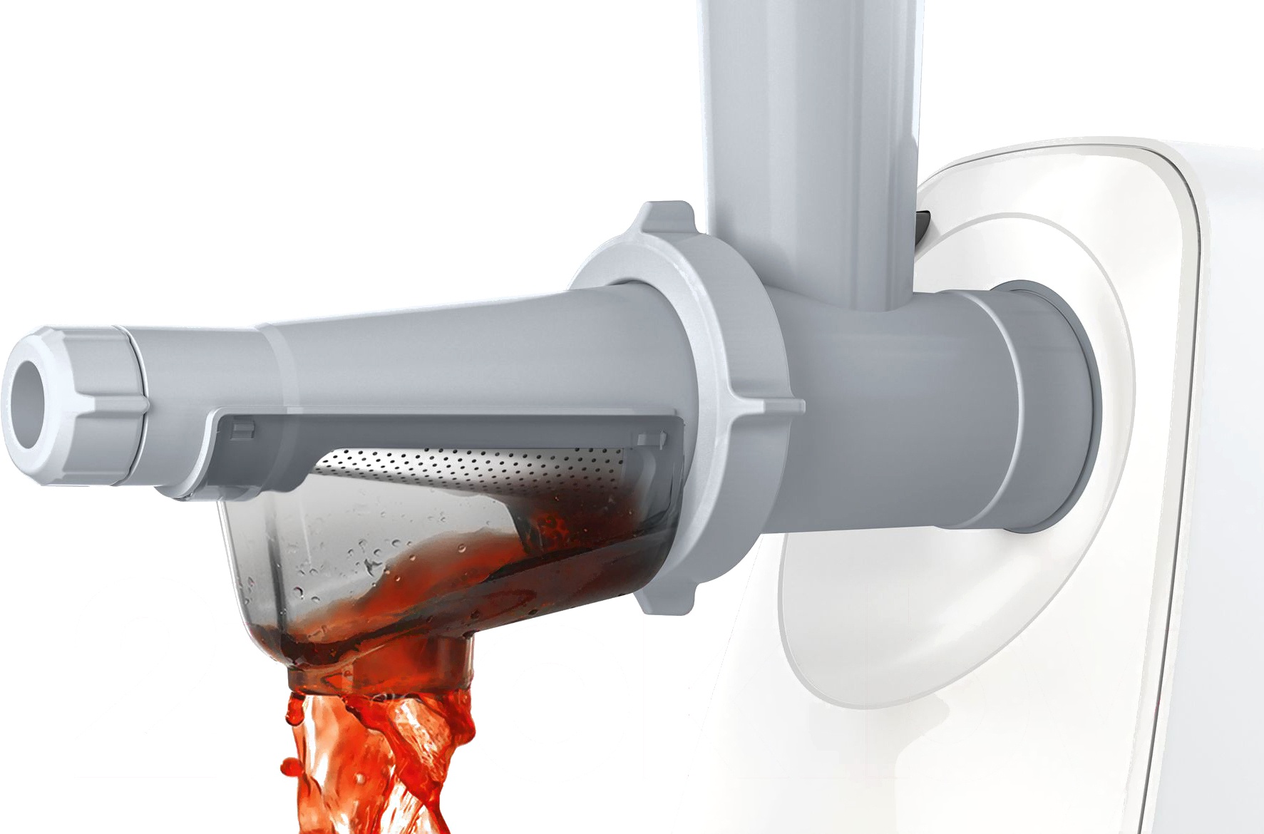 Мясорубка Bosch MFW2515W белого цвета является очень производительной (1.7 кг/мин), а поэтому ее удобно использовать в домашних условиях. С ее помощью вы сможете быстро намолоть нужное количество фарша из мяса или рыбы, а также выжать сок из фруктов или овощей и сделать домашние колбаски. Для всего этого в комплекте с мясорубкой имеются необходимые насадки. Корпус мясорубки и загрузочный лоток сделаны из пластика, что предусматривает простой уход за устройством. Двигатель мясорубки Bosch MFW2515W способен работать с максимальной мощностью в 1500 Вт, обеспечивая тем самым возможность перемалывать даже жилистое мясо. Причем двигатель защищен от перегрузки. Фарш можно делать разной консистенции, для чего предусмотрены два перфорированных диска. Все детали мясорубки легко собираются и разбираются. При необходимости некоторые из них можно мыть в посудомоечной машине. Для устойчивости мясорубки в процессе работы она оснащена прорезиненными ножками.
