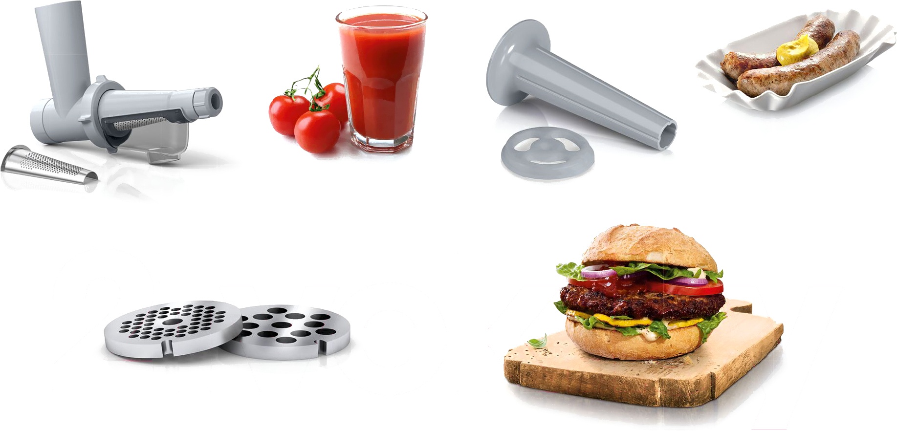 2 перфорированных диска для фарша 3.8 мм и 8 мм, 1 насадка для колбас, насадка-соковыжималка, документация, толкатель, загрузочный лоток