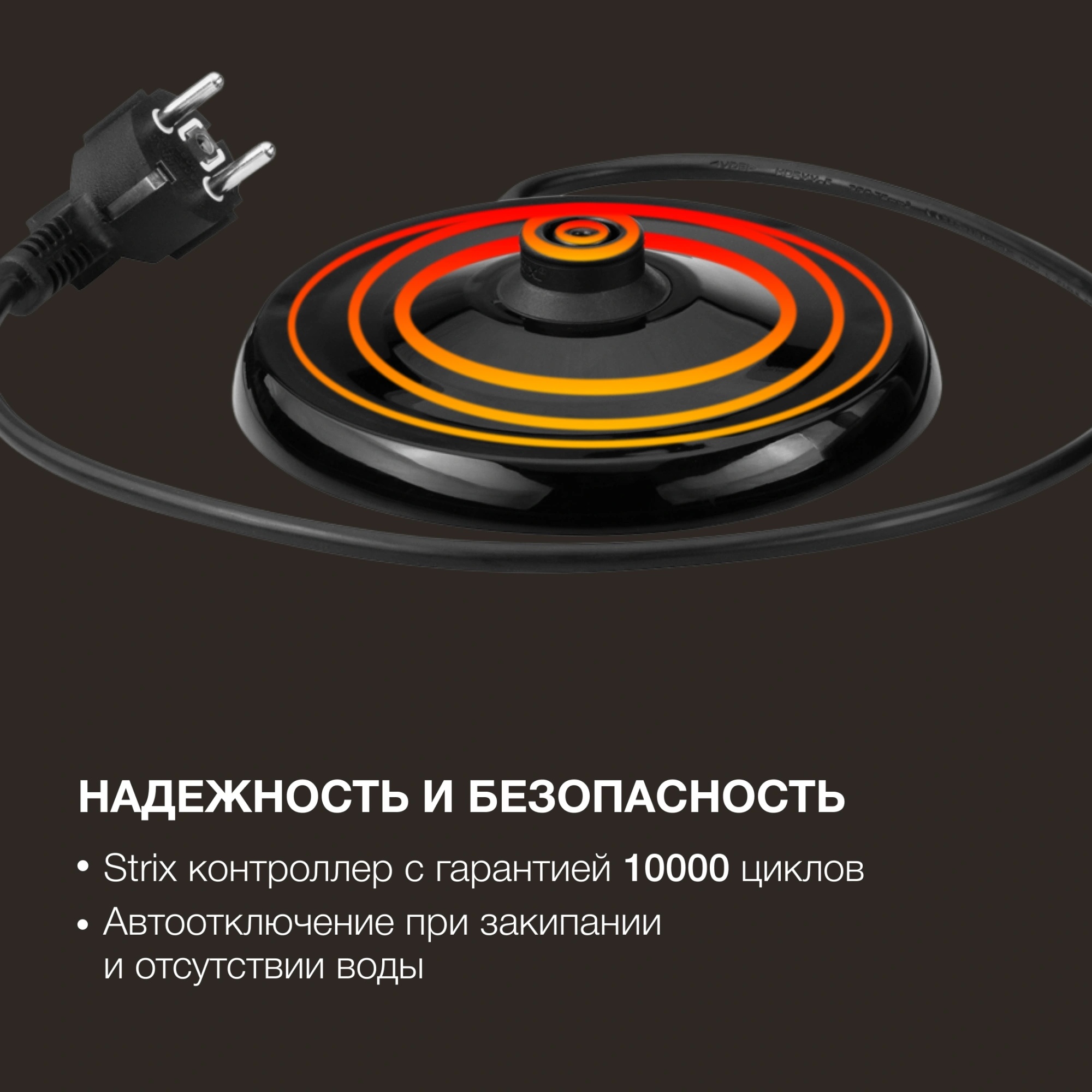 Стильный чайник с красивой голубой LED-подсветкой и корпусом из высококачественного боросиликатного стекла – лёгкого и прочного материала, который не темнеет и не окрашивается со временем. Чайник оснащён контроллером STRIX – основным компонентом электроцепи, надёжность и долговечность которого обеспечены многолетним опытом лидирующей английской компании-производителя. Модель имеет скрытый нагревательный элемент, блокирующуюся крышку с открытием отдельной кнопкой, автоматическое отключение, защиту от включения без воды.
