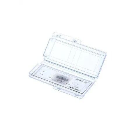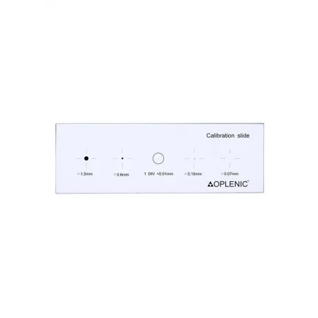 Калибровочный (микрометрический) слайд предназначен для проведения калибровки программы анализа изображений для измерения расcтояний в реальных единицах. Калибровочный слайд представляет собой прозрачное стекло (по размеру предметного стекла микроскопа) с нанесенной на него микрометрической шкалой с разрешением 0.01 мм. Сняв изображение микрометрической шкалы при каждом рабочем увеличении микроскопа и указав известное расстояние в режиме калибровки, Вы задаете масштаб изображения в реальных единицах (микрометр, миллиметр и т. д.).