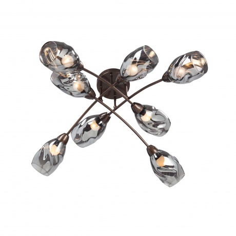 Потолочная люстра будет отлично смотреться в гостиной, спальне, кухне в стиле арт-деко. Люстра имеет 8 плафонов из прозрачного и черного стекла с цоколем 8xE27. Питание от сети 220V, общая максимальная мощность 320W позволяет осветить площадь до 16 кв. м.