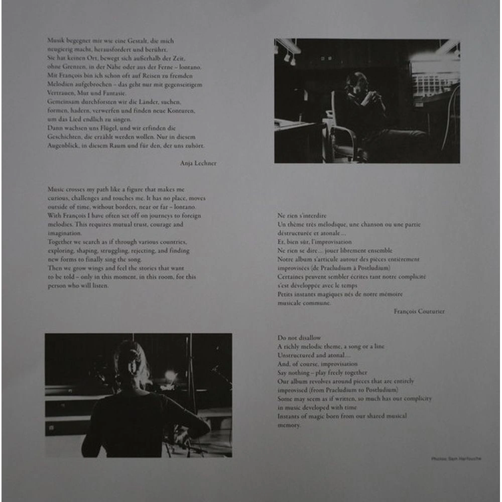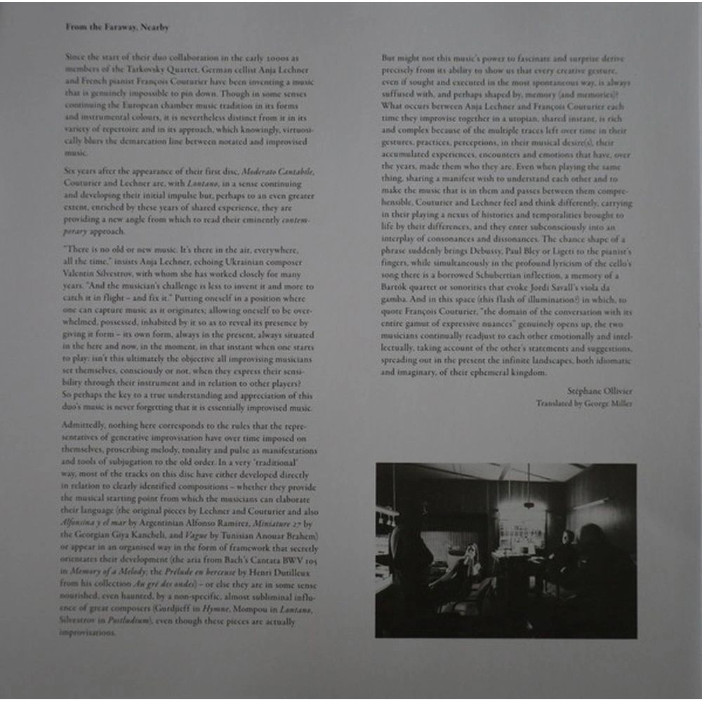 Совместный альбом немецкой виолончелистки Аня Лехнер и французского пианиста Франсуа Кутюрье. После дебютного альбома 2014 года в качестве дуэта, "Moderato cantabile", Аня Лехнер и Франсуа Кутюрье еще больше расширили музыкальный диапазон на этом новом альбоме. С самого начала совместной работы, в начале 2000-х годов в составе Tarkovsky Quartet, дуэт изобретает музыку, которую действительно невозможно определить. Они имеют свой собственный голос, будь то оригинальные композиции, свободные импровизации, опирающиеся на кантату Баха или аргентинское народное творчество, или тонкое включение произведений Анри Дютийе, Гии Канчели или Ануара Брахема. «Нет старой или новой музыки. Она витает в воздухе, везде, все время», - настаивает Аня Лехнер, вторя украинскому композитору Валентину Сильвестрову, с которым она тесно сотрудничает много лет. Усвоив влияния и репертуар, немецкая виолончелистка и французский пианист не только обнаруживают атмосферные и выразительные связи между обширными источниками, но и создают новую музыку, которая отражает и преломляет ее вдохновение. На этой новой записи случайная форма фразы внезапно приводит Дебюсси, Пола Блея или Лигети к пальцам пианиста, в то время как в глубокой лирике виолончели присутствует заимствованная шубертовская интонация, воспоминание о квартете Бартока или звучности, которые вызывают Виола да гамба Жорди Саваля. Результатом является прекрасно продуманная встреча музыкальных умов с осязаемой нитью общих исполнительских навыков. Музыка расслабляет, стимулирует и открывает ваш разум (и уши!) для новой концепции исполнения.