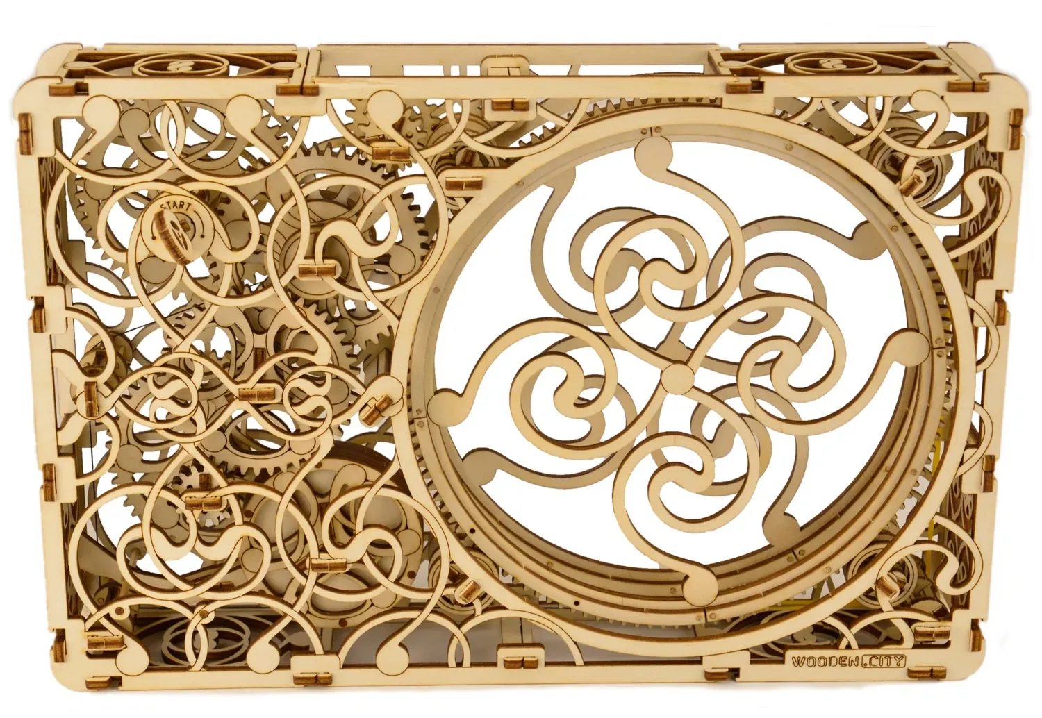 Механическая картина — это деревянный 3D пазл c открытым механизмом, который легко можно привести в движение благодаря нескольким оборотам ключа. В картине нет никакой электроники, элементы заставляет двигаться специальный резиномотор. Пазл собирается очень легко, вам не понадобятся какие-либо инструменты, все элементы выдавливаются легким нажатием. Количество деталей: 265 штук. Размер модели 23х6х35 см.