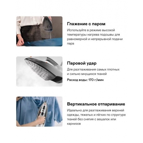 Используйте утюг как в сборке с блоком питания, так и в беспроводном режиме. Керамическое покрытие подошвы CERAMIC G-PRO. Сверхлёгкое скольжение и бережная глажка любых тканей. Мощность 2400 Вт. Максимально быстрый нагрев и поддержание оптимальной температуры в любом режиме работы. Диапазон нагрева от 70 C до 220 C. Подбирайте нужный режим и оптимальную температуру для натуральных и искусственных волокон, для самых деликатных или самых плотных тканей.