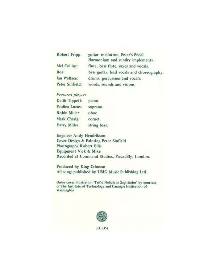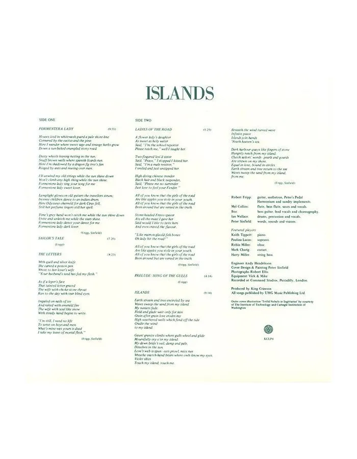 Islands - четвертая студийная работа King Crimson, изданная в 1971 году. Это последний альбом группы, содержащий тексты Питера Синфилда и имеющий традиционное звучание в стиле прог-рок. Также, это единственная пластинка группы (за исключением концертной Earthbound) с вокалом Боза Баррела. Британская рок-группа King Crimson была основана в 1968 году барабанщиком Майклом Джайлзом и гитаристом Робертом Фриппом. Коллектив постоянно менялся, несколько раз происходил развал группы и её воссоединение. Единственным постоянным участником остаётся Роберт Фрипп. В 2009 году произошел очередной развал, в настоящий момент официальная дискография группы насчитывает 13 альбомов.