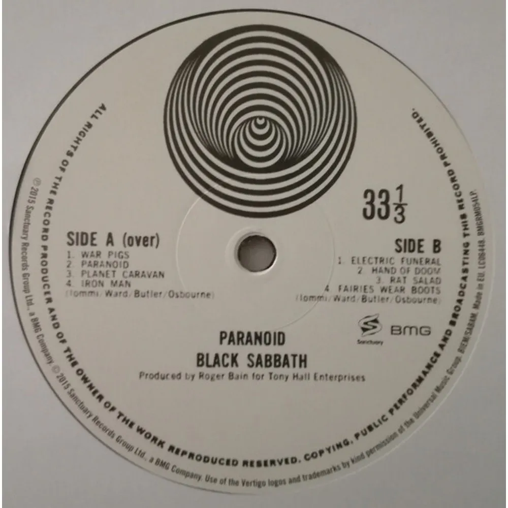 Издание на виниле альбома "Paranoid" британской метал-группы Black Sabbath. Пластинка увидела свет в 1970 году, на родине она достигла первого места в чарте, а в США только 12-го. Заглавная песня с альбома была написана в последнюю минуту после просьбы лейбла о композиции для сингла.