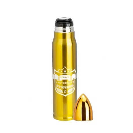 Термос подарочный Патрон предназначен для хранения горячих и холодных напитков. Снаружи и внутри термос изготовлен из высококачественной нержавеющей стали с вакуумной теплоизоляцией между колбой и корпусом. Термос обеспечен герметичной крышкой с теплоизоляционным материалом. Любители путешествий и активного отдыха оценят все преимущества термоса.Вес 593 гр. Материал сталь нержавеющая, пластмасса. Страна производства Китай. Высота, см 37. Длина, см 7. Ширина, см 7. Внимание! Товар представлен в нескольких цветах, без возможности выбора. Цена указана за 1 шт.