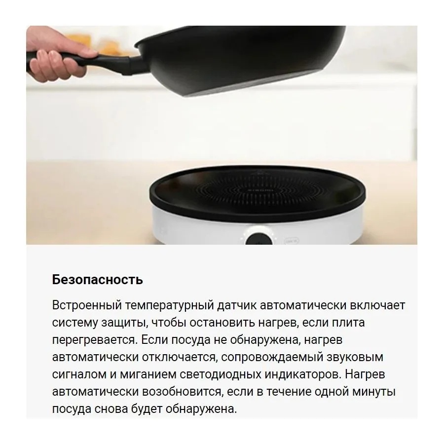 Индукционная плита Xiaomi Cooker Lite (BHR8130EU) — это элегантное и функциональное устройство для приготовления пищи. Она оснащена удобной ручкой управления со светодиодной подсветкой для точной и чёткой регулировки температуры. Благодаря усовершенствованной конструкции двухслойной катушки и мощности 2100 Вт, плита обеспечивает равномерную теплопередачу и высокое качество приготовления блюд. Силиконовая накладка и система безопасности делают использование плиты безопасным и надёжным. Плита имеет 9 ступеней регулировки температуры, что позволяет подобрать оптимальный способ приготовления в зависимости от потребностей. Термостойкая нескользящая силиконовая накладка удерживает посуду с приготовляемой едой на месте и легко снимается для очистки. Вентиляционные отверстия для горячего и холодного воздуха изолированы, чтобы предотвратить повторное попадание горячего воздуха, снижая внутреннюю нагрузку. 7-лопастной осевой вентилятор улучшает теплоотвод и продлевает срок службы устройства. Встроенный температурный датчик автоматически включает систему защиты, чтобы остановить нагрев, если плита перегревается. Если посуда не обнаружена, нагрев автоматически отключается, сопровождаемый звуковым сигналом и миганием светодиодных индикаторов. Нагрев автоматически возобновится, если в течение одной минуты посуда снова будет обнаружена.