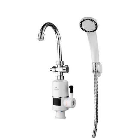 Смеситель для ванны FASHUN (A560) - проточный электрический смеситель с дисплеем, изготовленный из высокопрочного ABS. Он оснащён нагревательным элементом и УЗО, что обеспечивает безопасность использования. Дизайн смесителя сочетает белый и хромированный цвета, что делает его стильным дополнением к ванной комнате.