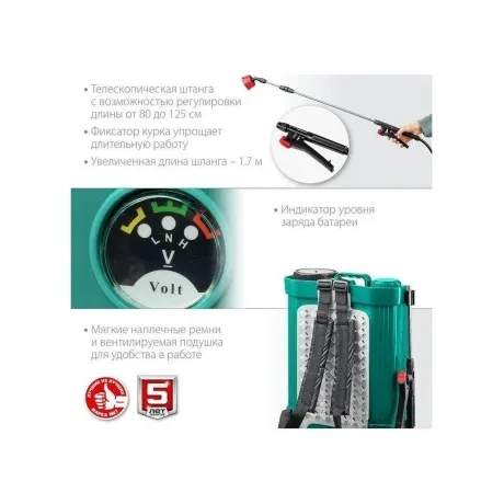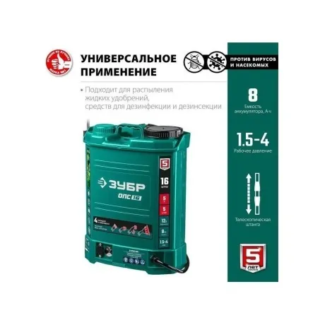 Аккумуляторный опрыскиватель ЗУБР 16 л ОПС-16 отличается эффективностью, мобильностью, экологичностью. Бережно орошает растения. Подходит для дезинфекции, мытья окон и стен. Работает от свинцово-кислотного аккумулятора напряжением 12 В. За счет наличия ремней обеспечивается удобство переноски на спине.