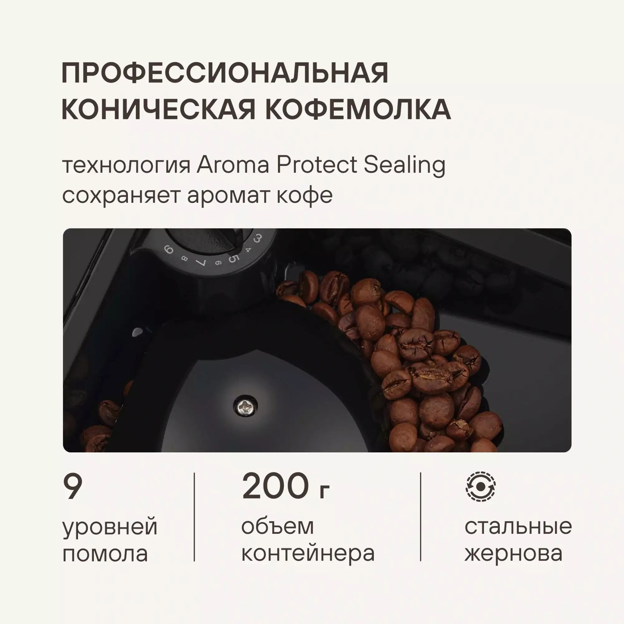 Количество молотого кофе можно регулировать самостоятельно: просто поверните ручку, фиксируя ее на определенном показателе от 2 до 12. Прибор оборудован съемными прозрачными контейнерами для зерен емкостью 250 г и для молотого кофе объемом 125 г. Особому удобству в использовании прибора способствуют прорезиненные ножки, которые не дадут