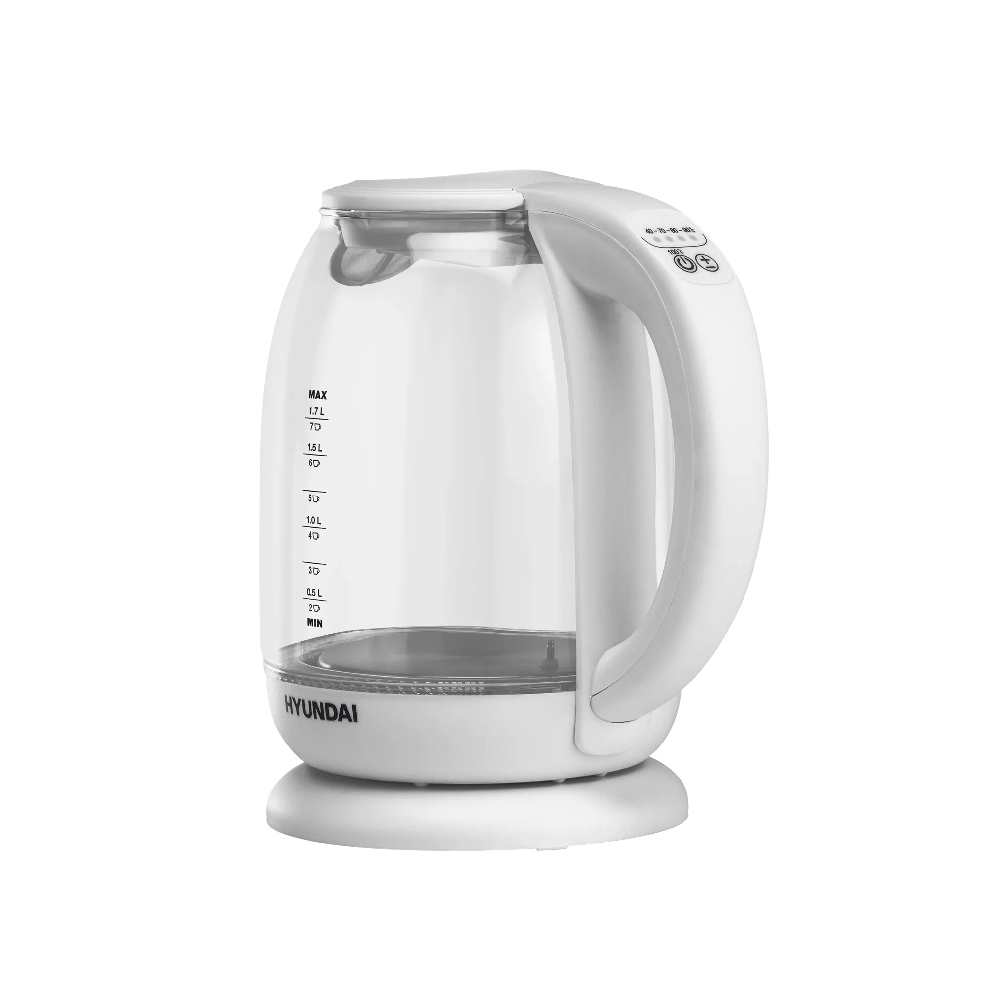Электрический чайник HYUNDAI HYK-S3808 мощностью 2200 Вт вскипятит 1.7 л воды в считанные минуты. Оснащен скрытым нагревательным элементом. Снабжен индикаторами включения и уровня воды, имеется фильтр, препятствующий попаданию накипи в чашку. Предусмотрены автоматическое отключение, регулировка температуры нагрева, защита от включения без воды, поддержание температуры жидкости, звуковой сигнал при закипании. Крышка обладает специальной кнопкой открытия. Устройство работает в 5 температурных режимах с цветовой индикацией: цветовая гамма подсветки меняется по ходу изменения температуры воды. Устанавливается на платформе, вращающейся на 360 градусов.