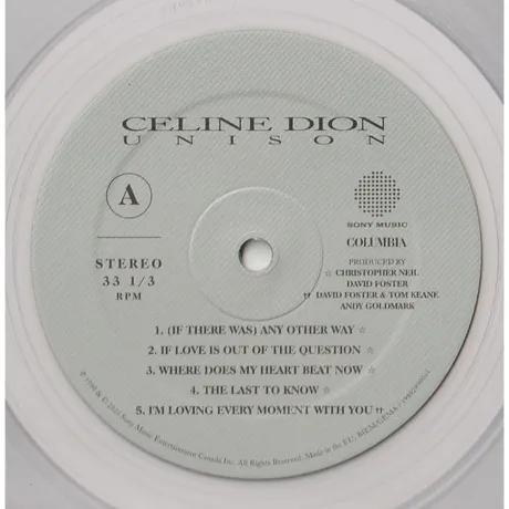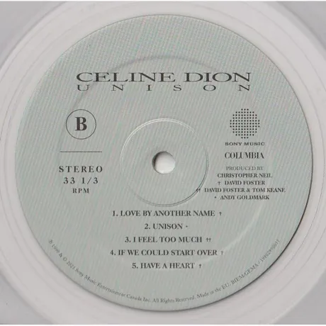 Unison — девятый студийный альбом канадской певицы Селин Дион и ее первый альбом на английском языке, выпущенный в 1990 году. 10 песен альбома включают хиты Where Does My Heart Beat Now, (If There Was) Any Other Way и Unison. Издание на прозрачном виниле. Unison — первый альбом Селин, записанный на английском языке. Для альбома была собрана сильная команда продюсеров, авторов текстов и композиторов. Среди них Крис Нил (Шина Истон, Mike + The Mechanics), Пол Блисс (Эми Холланд), Альдо Нова (Альдо Нова, Blue ?yster Cult, Джон Бон Джови) и Дэвид Фостер (Уитни Хьюстон, Барбра Стрейзанд, Чикаго). Благодаря ее упорному труду и таланту альбом cделал голос молодой певицы из Квебека известным всему миру. Альбом был продан тиражом более 3 млн экземпляров по всему миру, а наибольшего успеха альбом завоевал в США и Канаде. По данным Sony Music Entertainment, Дион продала более 220 миллионов альбомов по всему миру и является самой продаваемой певицей всех времён.