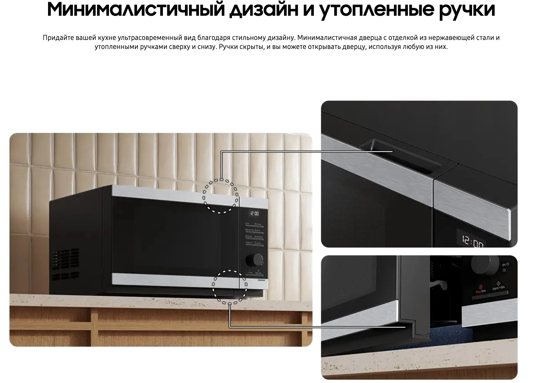 Придайте вашей кухне изысканный вид благодаря стильному дизайну микроволновой печи Samsung MG23DG4524ATBW. Минималистичная дверца с отделкой из нержавеющей стали и утопленными ручками сверху и снизу. Ручки скрыты, и вы можете открывать дверцу, используя любую из них. Наслаждайтесь надежным и удобным способом приготовления блюд с помощью гриля. Готовит, разогревает и поджаривает еду с помощью комбинации микроволн и нагревательного элемента, основанной на оптимальных алгоритмах. Нагревательный элемент (ТЭН) не нуждается в защитной оболочке, что облегчает его очистку. В меню представлены наиболее часто используемых виды продуктов: мясо, птица, рыба, овощи . Просто выберите тип и вес продукта и программа рассчитает оптимальное время размораживания, сохраняя при этом питательные свойства. Ускоренная, быстрая или 3D – это качественная разморозка. Одним касанием из замороженного в свежее!