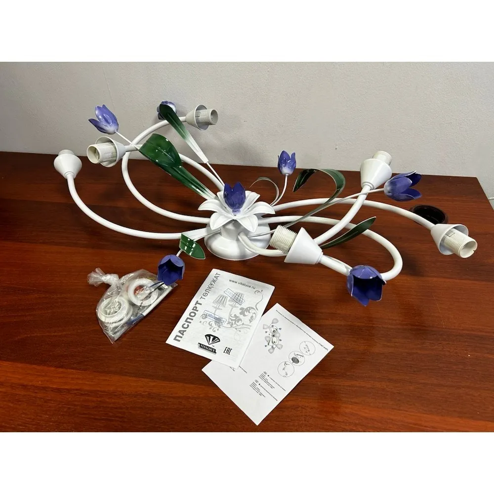 Причина уценки: витринный образец (отсутствуют плафоны, повреждена коробка, потертости на каркасе) Внешний вид: хорошее состояние Комплектность: коробка, каркас люстры, крепления, документация