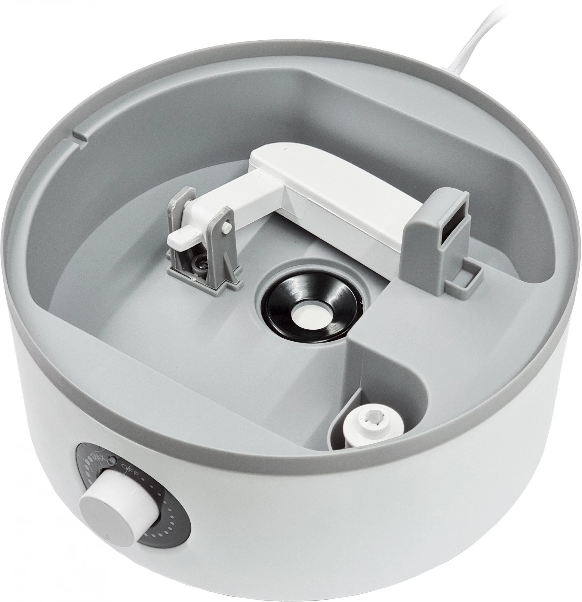 Гигрометр у ультразвукового увлажнителя воздуха PRIMERA HUP-R1060-TA отсутствует. Можно отрегулировать мощность пара устройства, а влажность поддерживается автоматически. При отсутствии воды прибор отключится, поскольку он оснащен индикатором отсутствия воды. Есть ароматизатор, который повышает функциональность прибора. Белый корпус выполнен из прочного, но легкого пластика, поэтому вся конструкция весит лишь 1,21 кг.