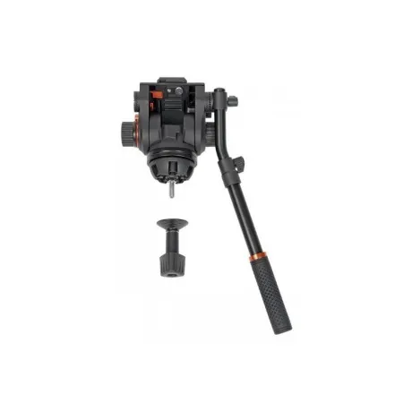 Съёмная голова с жидкостным демпфированием и системой постоянного контрбаланса поворачивается на 360? по горизонтали, наклоняется на углы от -60° до +90°, имеет независимые фиксаторы панорамирования, четырёхсекционный регулятор контрбаланса и бесступенчатый регулятор вертикального демпфирования. Голова изготовлена из алюминиево-магниевого сплава. Благодаря жидкостному демпфированию все движения происходят плавно и без рывков. Дополнительно голова оснащена предохранителем площадки, кнопка которого находится на левой стороне. Также на левой стороне головы есть отверстие с системной резьбой 3/8“ для установки дополнительного оборудования или, в зависимости от резьбы на вашей камере, можно ввернуть «лишний» винт для исключения его потери. Винтовое крепление головки к штативу выполнено из стали. На быстросъёмной площадке (стандарт Manfrotto) предусмотрены винты c резьбой 1/4 и 3/8“ (входят в комплект), подпружиненный штифт и противоскользящая вставка. Площадку можно смещать вперёд и назад и фиксировать в выбранном положении. Размер площадки — 50 х 140 мм.