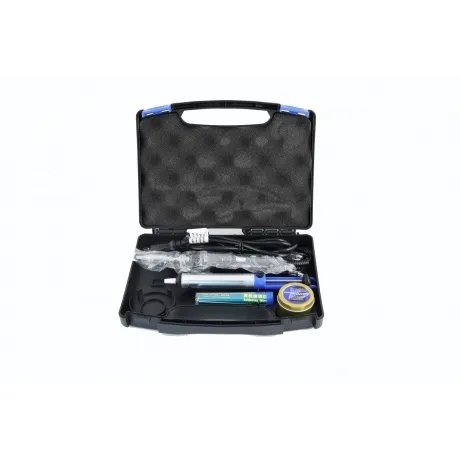 Element 947-III станет одним из самых востребованных наборов инструментов Вашего домашнего оснащения, ведь именно при помощи паяльника можно осуществить пайку и распайку самых различных материалов, будь то блок питания, микросхема или система электропроводки, то есть, всего того, что нас окружает в повседневной жизни. При этом сопутствующие элементы в виде оловотсоса, пинцета и очистителя позволят производить паяльные работы в полной мере и без необходимости докупать эти инструменты отдельно. Эргономичный дизайн рукояти паяльника, которая противостоит нагреву и обладает удобным хватом предполагает так же размещение функциональной детали инструмента - регулятора температур, благодаря которому легко и быстро можно задать оптимальный нагрев жала в соответствии с видом производимых работ.
