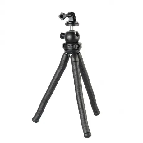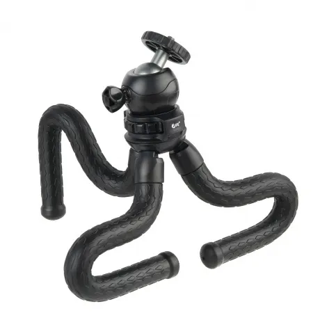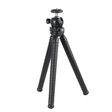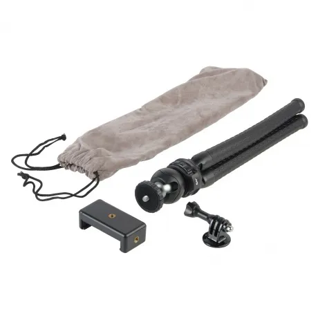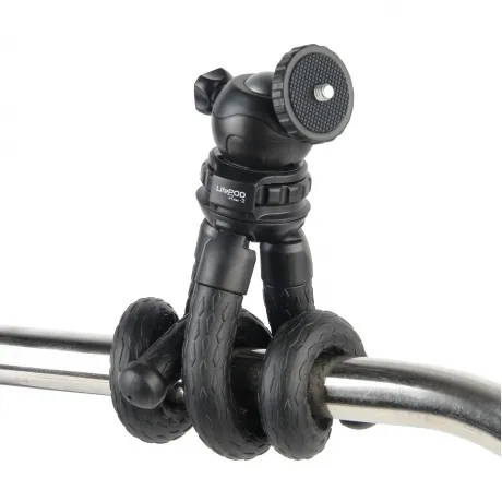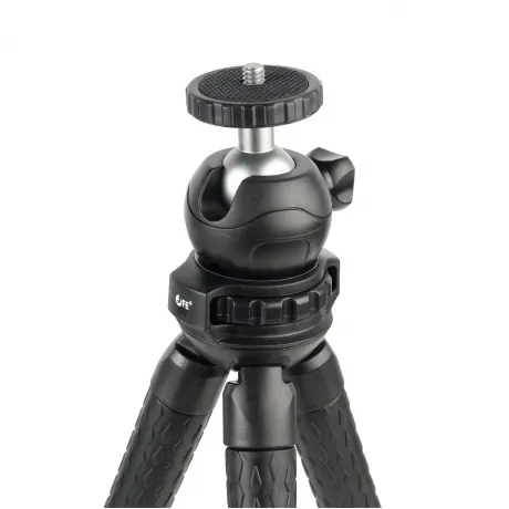 Штатив Falcon Eyes LifePOD Flex-2 с тремя гибкими ножками поможет быстро установить легкую фотокамеру (весом до 1.2 кг), смартфон или камеру GoPro даже на самой сложной поверхности в экстремальных условиях: на выступе, перилах, полке, трубе, ветке дерева и др. Штатив можно использовать как универсальный держатель или подставку для гаджетов (например, электронных книг и планшетов). Ножки штатива сгибаются в любом направлении под любым углом и остаются в зафиксированном положении на длительное время. Благодаря особому материалу отсутствует эффект остаточного напряжения, работающего на выпрямление – главное не превышать допустимую нагрузку, на поверхности ножек не остается заломов и вы сможете использовать штатив долгие годы. Обрезиненная фактурная поверхность ножек не скользит и штатив (а значит камера) устойчиво закрепятся в нужном положении. Для установки камеры на площадке штатива размещен стандартный винт диаметром ?, на который может устанавливаться цифровая камера, а также комплектные шаровая головка, адаптеры для смартфона или камеры GoPro. Дополнительное удобство установки: чтобы закрепить камеру на штативе, достаточно вращать винт с помощью крупного колесика в основании площадки, не нужно вращать саму камеру. Шаровая головка предназначена для установки камеры под наклоном 90° и легкого вращения на 360°, положение камеры фиксируется при помощи винта. Шаровая головка закрепляется на штативе, а на нее устанавливается камера, адаптер для смартфона или камеры GoPro. Адаптер для смартфона позволяет закрепить устройство шириной до 85 мм. Комплект упакован в чехол длиной всего 35 см – для компактного хранения и транспортировки.
