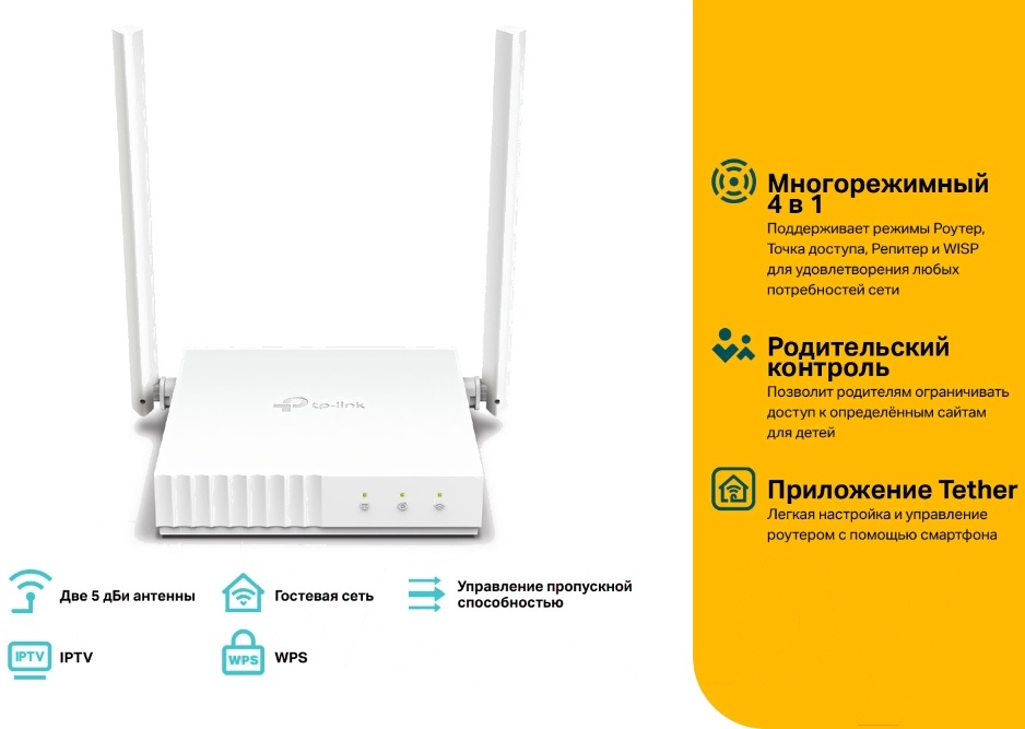 Wi-Fi роутер TP-LINK TL-WR844N — это компактное и производительное решение для вашего дома или небольшого офиса. С помощью данной модели вы сможете легко подключить сразу несколько компьютеров, телефонов или других устройств к сети Интернет. Для этого на корпусе предусмотрено 4 порта LAN со скоростью передачи до 100 Мбит/с. Wi-Fi роутер TP-LINK TL-WR844N также может работать и в беспроводном режиме. Благодаря поддержке стандарта 802.11n, а также технологии многополосной передачи данных MIMO 2x2 скорость передачи данных по частоте 2.4 ГГц может достигать 300 Мбит/с. Встроенный передатчик мощностью 20 dBm вкупе с 2 внешними всенаправленными антеннами, коэффициент усиления которых достигает 5 dBi, обеспечивает большое покрытие и стабильный сигнал вне зависимости от количества подключенных устройств. Также модель отличается высокой безопасностью за счет поддержки межсетевого экрана, технологии SPI и других инструментов защиты. Wi-Fi роутер TP-LINK TL-WR844N отличается простотой настройки и администрирования за счет поддержки Web-интерфейса и мобильного приложения TP-LINK Tether. Для работы используется сеть 220 В. Комплектация включает в себя адаптер питания и кабель Ethernet.