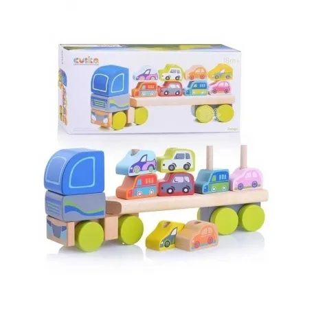 В комплекте 12 разноцветных деталей. Конструктор позволяет собрать автовоз с машинками. Сборка конструктора осуществляется путем нанизывания его элементов на деревянные штырьки.
