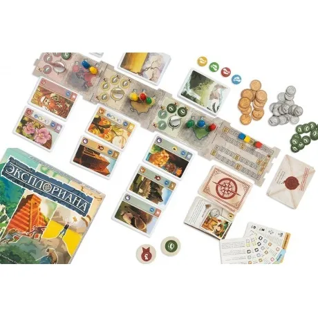 4 участка игрового поля, 8 деревянных фигурок экспедиций, 5 деревянных кубиков славы, 18 жетонов пропавших экспедиций, 2 жетона удачи, 4 жетона проводников, 3 фигурки реликвий, 50 жетонов монет, 107 карт открытий (24 для Южной Америки, 21 для Африки, 18 для Азии), 24 карты исследователей, 15 карт целей, 5 карт-памяток, правила игры